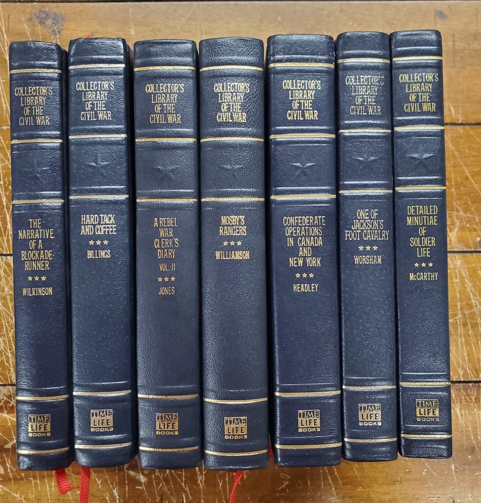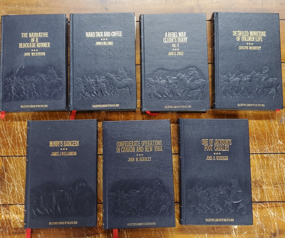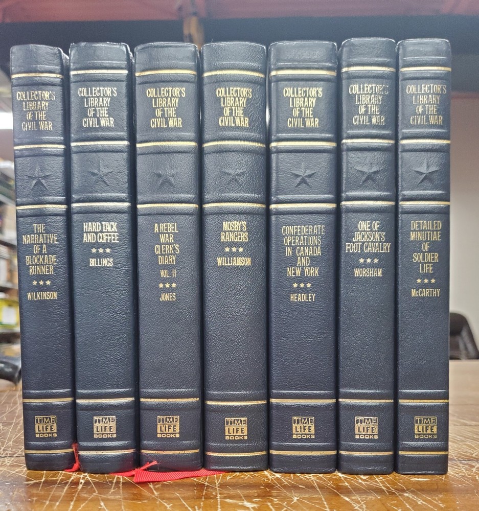 For lovers of American history, Civil War enthusiasts, and bibliophiles alike, we are proud to offer an impressive 7 volume set from the esteemed "Collector's Library of The Civil War." Included in this bundle are: " The Narrative of the Blockade " by John Wilkinson " Mosby's Ranger " by James J. Williamson " A Rebel War Clerk's Diary: Volume 2 " by John B. Jones " Confederate Operations in Canada and New York " by John W. Headley " Hard Tack and Coffee " by John D. Billings " Detailed Minutiae of Soldier Life " by Carlton McCarthy " One of Jackson's Foot Cavalry " by John H. Worsham The volumes are bound in luxurious leather, with distinct, classic gold embossing, lending an air of antiquity and elegance to your library. Inside, you'll find pages that are gilded and marbled, with a satin-ribbon page marker adding an additional touch of refinement. The books are in very good condition, a testament of their previous owner, making an elegant addition to any bookshelf. Don't miss this chance to own an integral part of American history. It's not just a set of books, but a captivating experience that will take you on a journey through one of the most significant periods in American history. Buy it now and dive into the fascinating world of the Civil War!