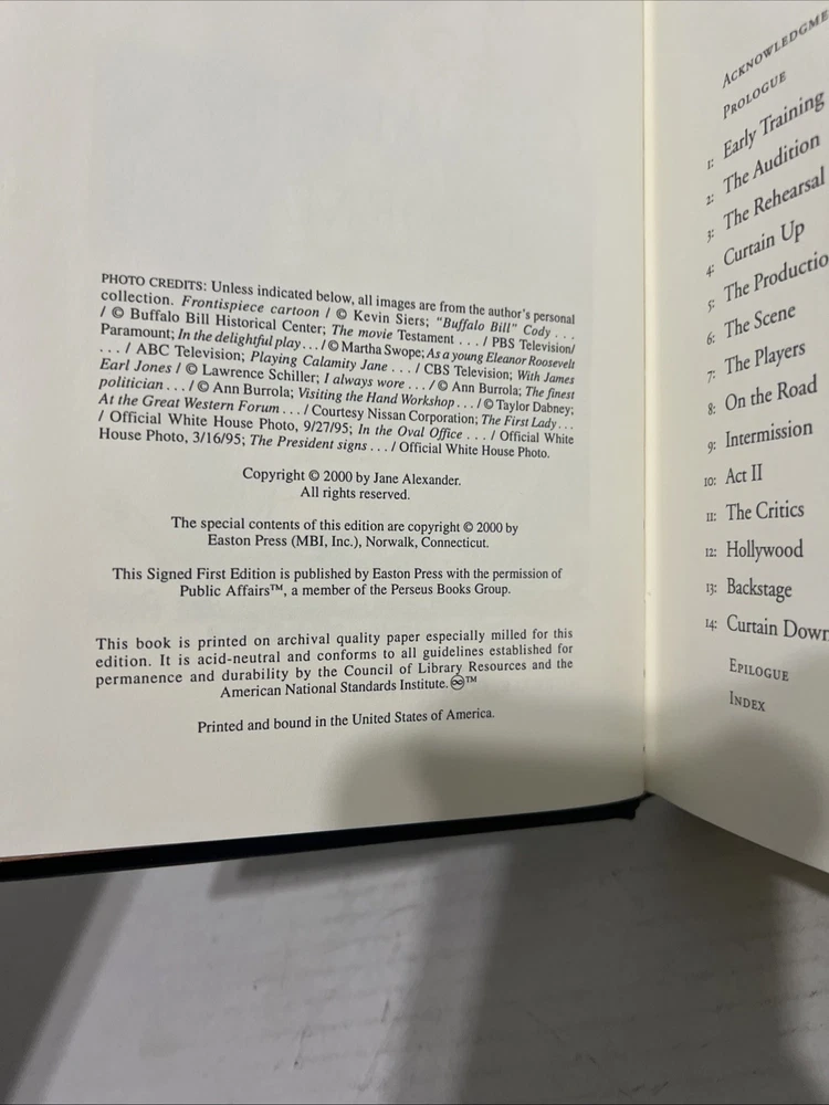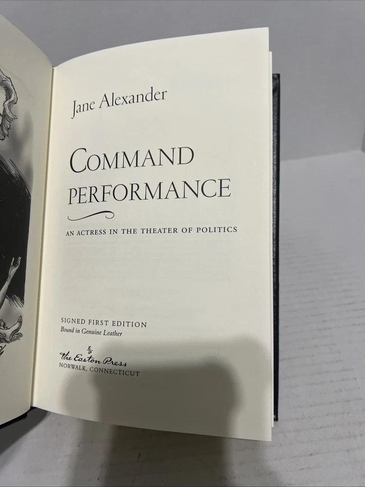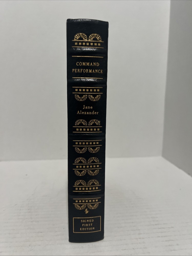 Command Performance is a first edition leather-bound book written by Jane Alexander. It is a collector's item that comes with a certificate of authenticity (COA). The book is signed by the author and is an original copy. It is also an illustrated and limited edition book published by Easton Press. The book's topic is theater and it is an autobiography of the author.