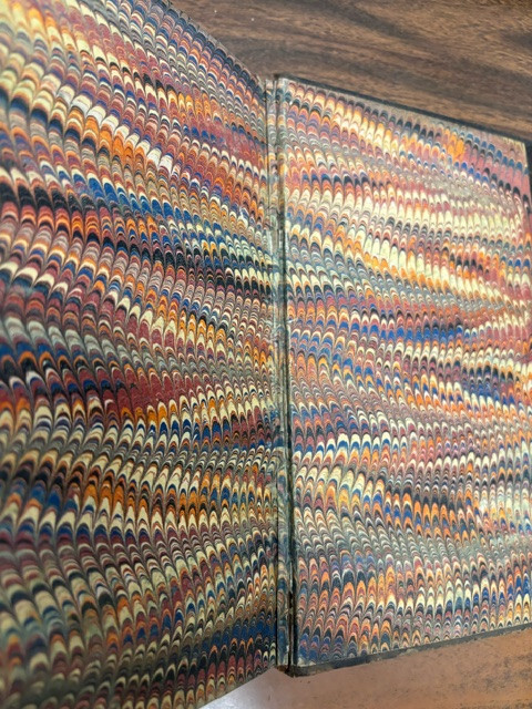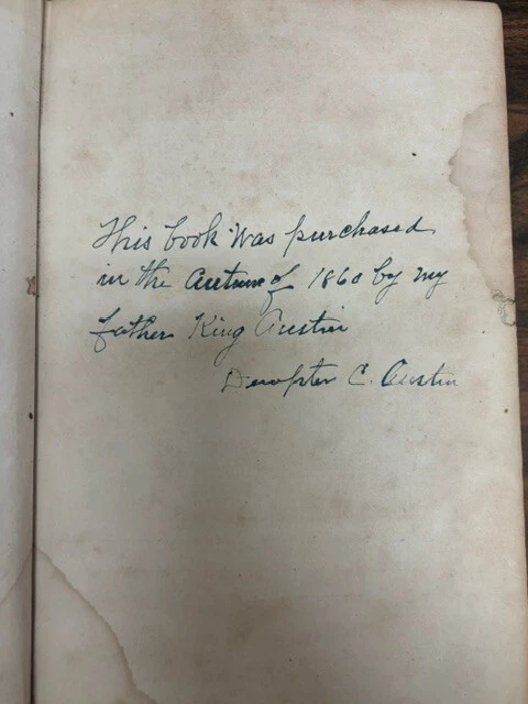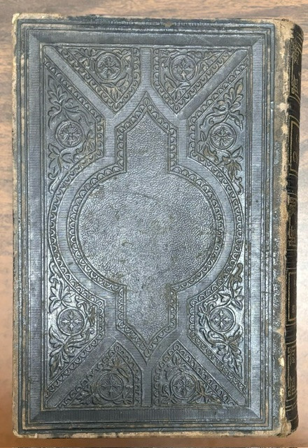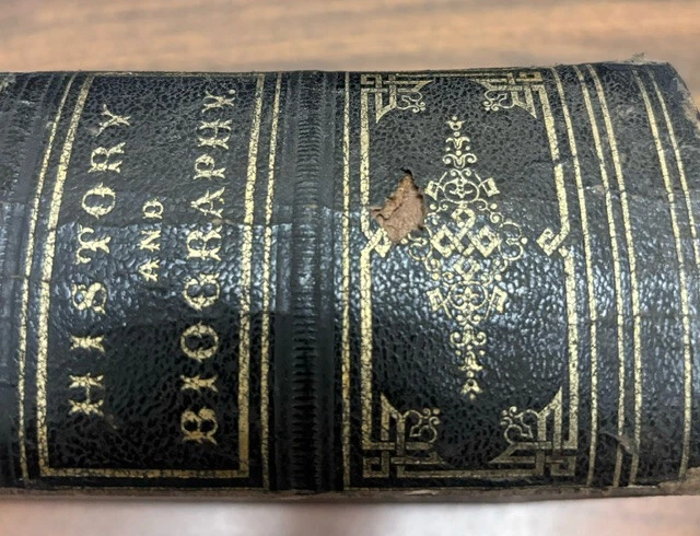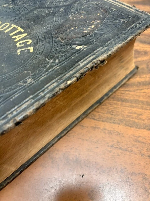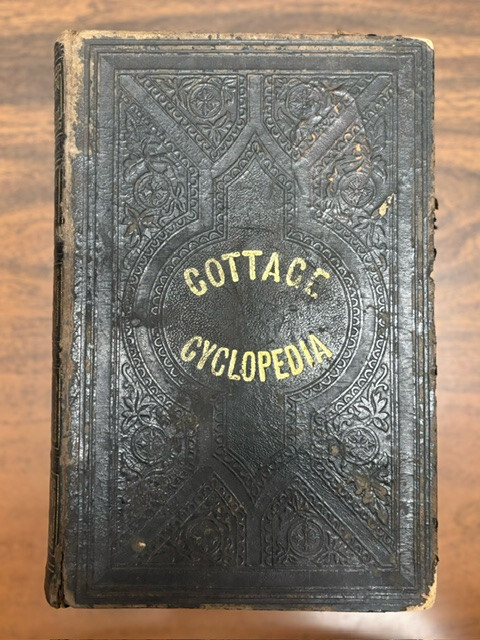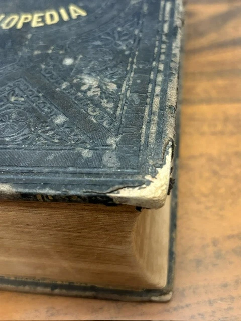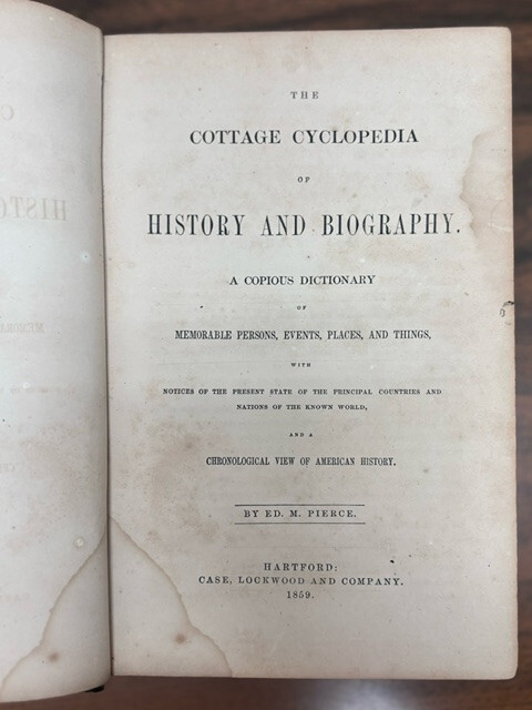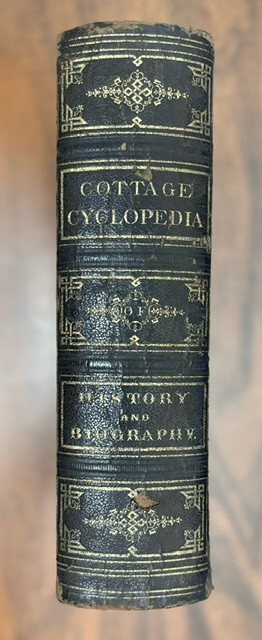 1859 copy of Cottage Cyclopedia of History and Biography by Ed M Pierce book in good condition for the age, leather binding still intact, small amount of separating at the bottom. Gold embossing on the cover still readable. small amount of bookworm damage to first couple of pages, no more evidence throughout the book. Staining and tanning to pages. All pages appear to be present. Hinge in front cracked, back hinge still intact. Binding is intact. leather wear on edges and corners.