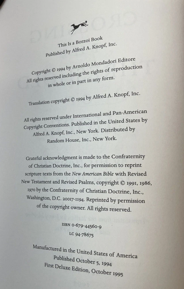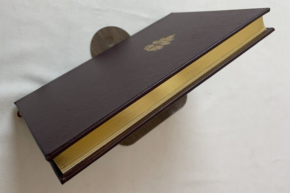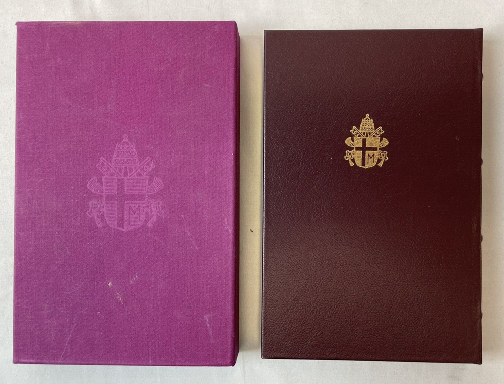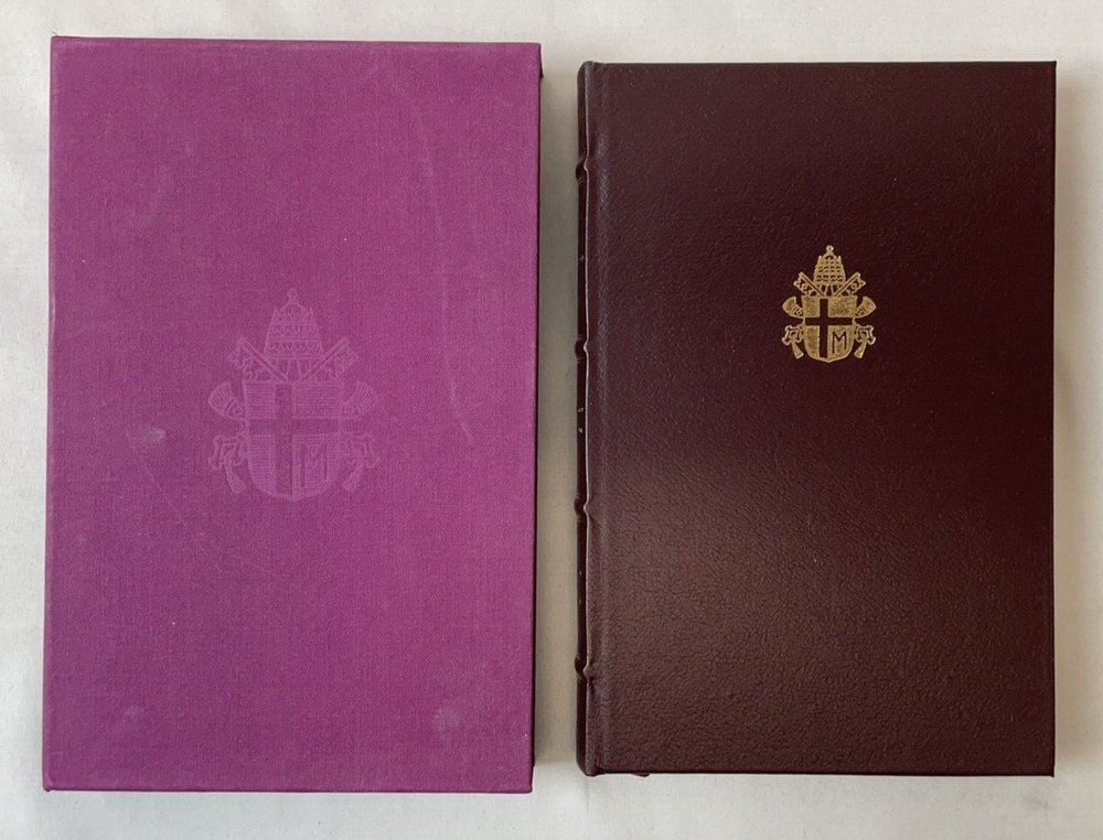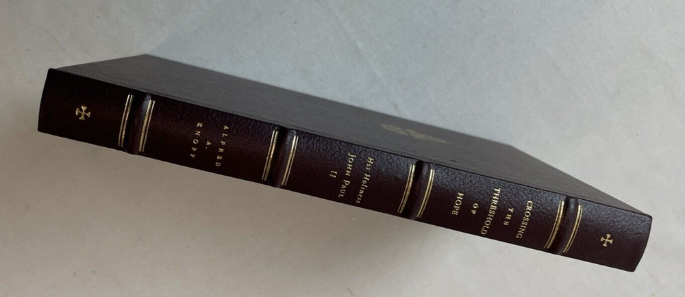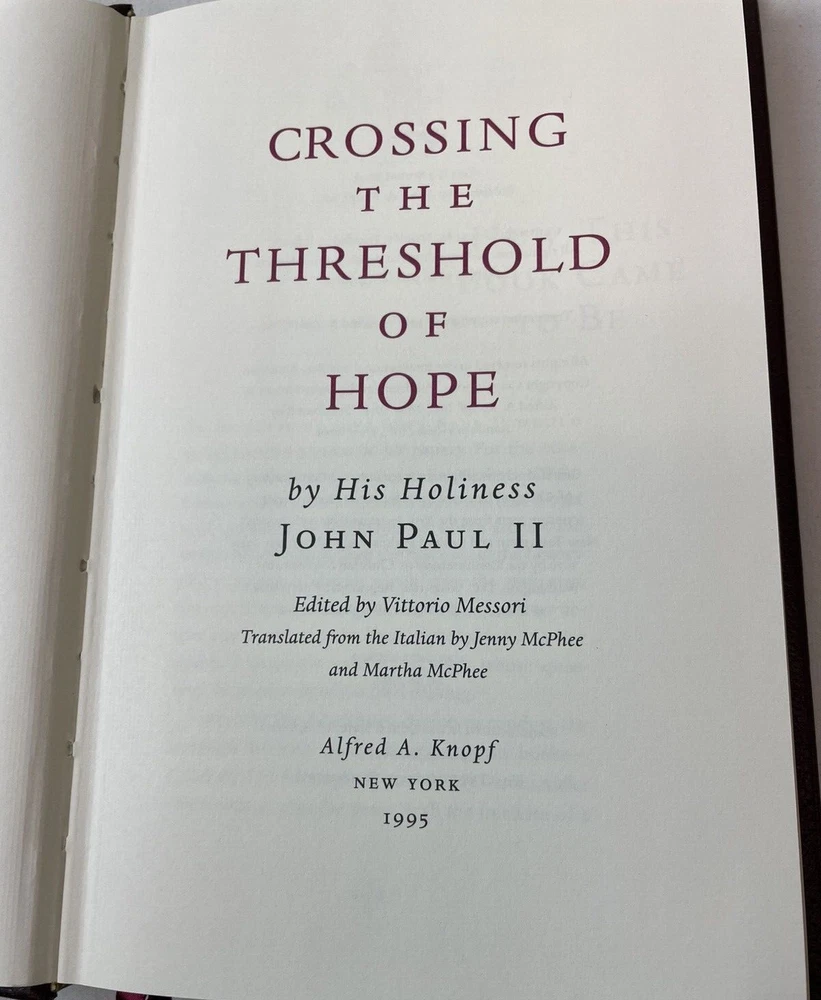 Immerse yourself in the profound reflections of "Crossing the Threshold of Hope" by Pope John Paul II, presented in its first deluxe edition in 1995. This hardcover treasure, bound in elegant faux leather and encased in a slipcase, offers a comprehensive look into the spiritual journey of one of the most influential figures of the 20th century. The book's 245 pages are a testament to his visionary leadership and an insightful resource for those interested in religious studies, Catholic history, and Christian ethics. Originally translated from Italian, this edition published by Alfred A. Knopf is a must-have for both collectors and seekers of enlightenment. Delve into the pages of this nonfiction narrative and explore the depths of faith and hope as articulated by a beloved pontiff. Book is in very good condition. Tight, square and unmarked. Gilt edges with gold colored printing on spine. End papers decorated. Has ribbon. Vatican City Coat of Arms embossed on front and back cover. Slipcase in fair to good condition. Several scuff marks and back of case shows yellow colored blemish. ly