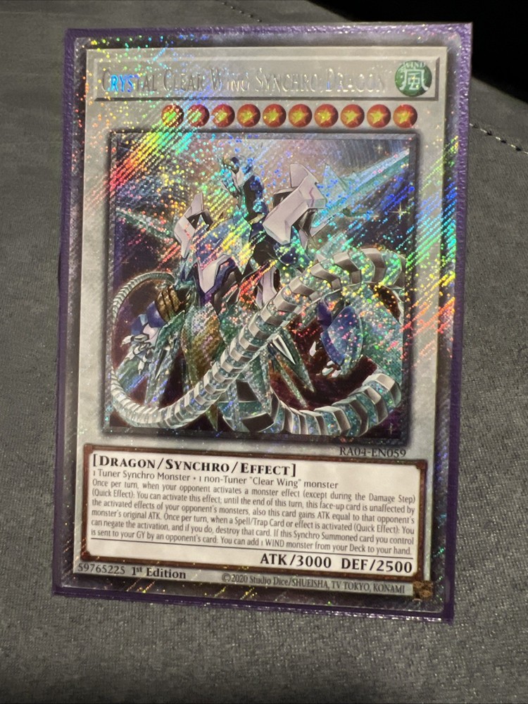 The Crystal Clear Wing Synchro Dragon (Platinum Secret Rare) RA04-EN059 1st Edition is a highly sought-after card in the Yu-Gi-Oh! TCG. This Wind-type Dragon card from the Quarter Century Stampede set boasts impressive stats of 2500 defense and 3000 attack power. Manufactured by Konami, this English-language card is a valuable addition to any collection, especially for fans of collectible card games and toys & hobbies. With its rarity and unique features, this card stands out as a top-tier choice for serious collectors.