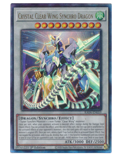 Absolutely love this Ultimate Rare Crystal Clear Wing Synchro Dragon! The artwork pops with stunning detail, and the condition is flawless straight from the pack—super clean with no noticeable flaws. Shipping was quick, well-packed, and secured. Highly recommended for collectors—worth every penny!