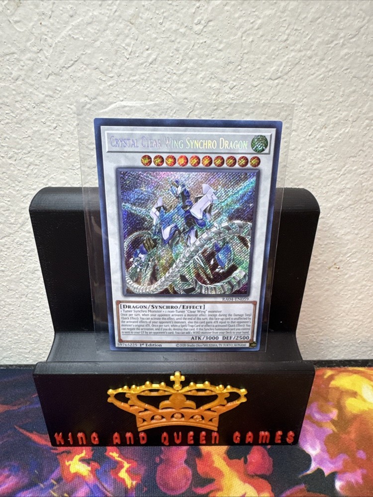 Elevate your Yu-Gi-Oh! TCG collection with the formidable Crystal Clear Wing Synchro Dragon, a Secret Rare gem from the Quarter Century Stampede set. Card number RA04-EN059 stands out with its 1st Edition status, ensuring it's a unique addition to any deck or display. This English-language card features the majestic Dragon creature type, boasting an attack power of 3000 and a defense toughness of 2500, ready to dominate the battlefield. Konami's craftsmanship shines with the card's intricate design and the captivating Wind attribute that hints at its spellbinding abilities. Whether you're a seasoned player or a dedicated collector, the Crystal Clear Wing Synchro Dragon is a must-have for its strategic value and rarity.