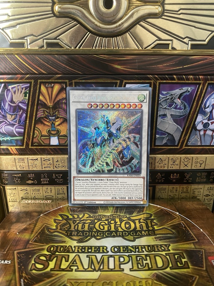 Crystal Clear Wing Synchro Dragon (Secret Rare) RA04-EN059 All Cards are Freshly Pulled, Sleeved and never Played. Cards are Sleeved with Top Loader , and Shipped in Envelope Conditions are Near Mint , if there's any Hair Scratching , Blemishes or Smudges , that's how they came in the packs.