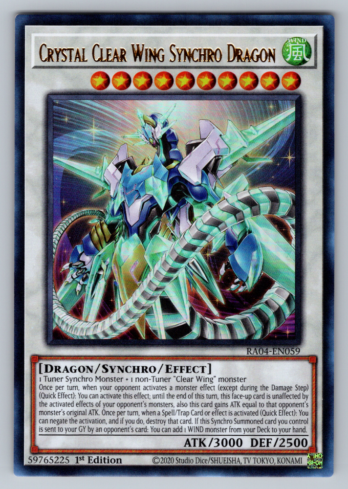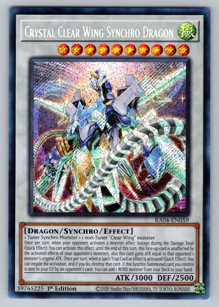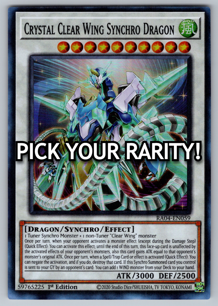 This listing is for Crystal Clear Wing Synchro Dragon - RA04-EN059 from the Quarter Century Stampede set . Each photo in this listing is a stock photo as this is a bulk variation listing. You will receive the same card in the same condition selected , but it may not be the exact copy from the photo . Therefore, centering on the card you receive may differ from the centering of the card listed in the photo. Please be aware of this before purchasing. Each card will be in Near Mint condition. Cards in this listing may have some very minor imperfections (such as few small dots of whitening or a couple of very small scratches), but there will be no major damage to the cards (such as excessive whitening, scratches, edgewear, creases, water damage, etc). The cards from your order will be securely packaged in a card saver and card saver perfect fit sleeve and shipped with the eBay Standard Envelope program for cards under $20. Whether you're looking to power up your deck or add this to your collection, you'll be sure to enjoy this card! Check out our other listings for more Yu-Gi-Oh! cards!