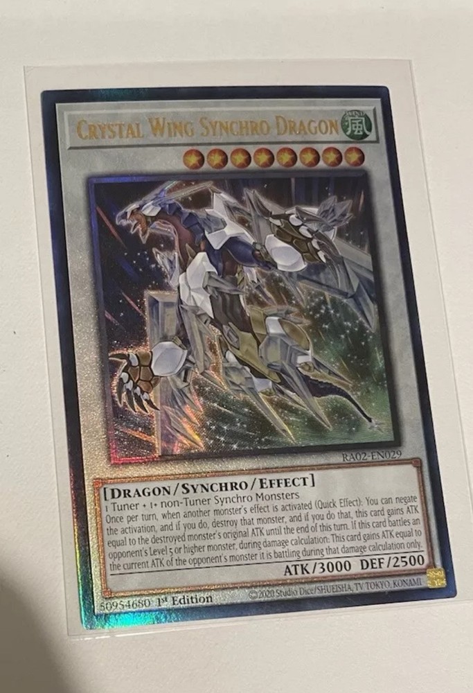 The product is a 1st Edition Ultimate Rare Crystal Wing Synchro Dragon card from the Yu-Gi-Oh! TCG. Manufactured by Konami, this card is part of the RA02-EN029 set and features a Holo finish. As a Synchro/Effect Monster with the attribute of Wind, it holds value as a powerful and sought-after card among collectors and players of the game. This rare and highly coveted card is a key addition to any Yu-Gi-Oh! card collection.