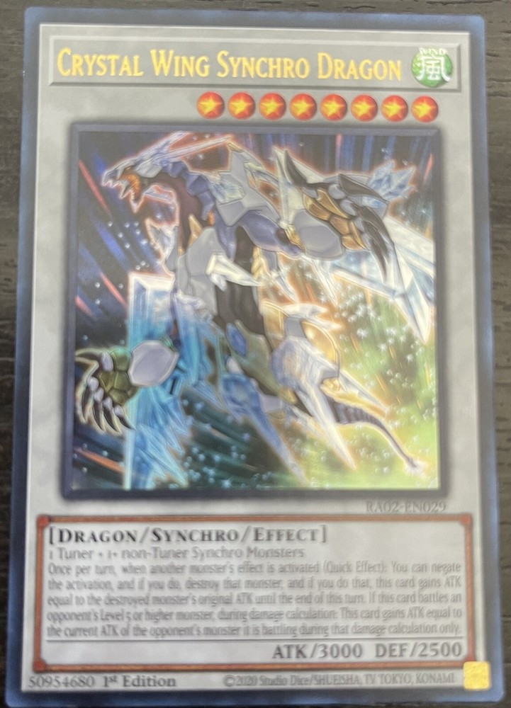 Get your hands on the ultimate Yu-Gi-Oh! collectible card, the Crystal Wing Synchro Dragon. This ultra-rare card is a must-have for any serious collector and is from the coveted "Yugi" set. With its striking design and unbeatable power, this card is sure to impress any opponent. Manufactured by Konami, this 1st edition card is a valuable addition to any Yu-Gi-Oh! TCG collection.