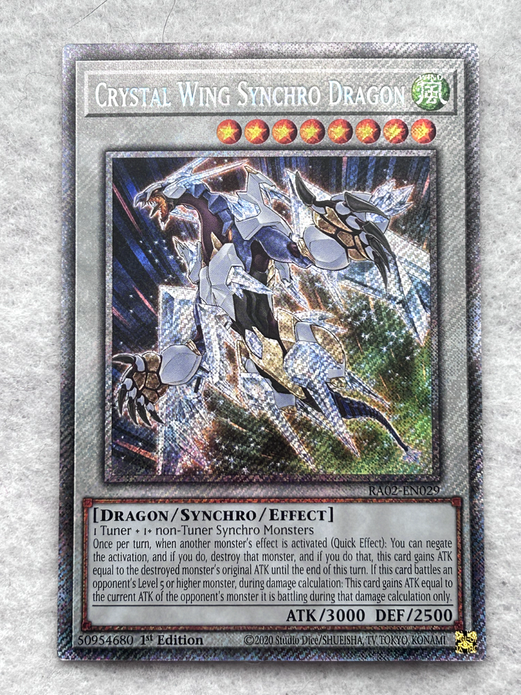 The product is a Platinum Secret Rare Yu-Gi-Oh! TCG card titled "Crystal Wing Synchro Dragon" from set RA02-EN029. Manufactured by Konami, this English language card is made of card stock with a holographic finish. The card is a Synchro/Effect Monster suitable for ages 6 and up, adding a rare and valuable addition to any Yu-Gi-Oh! TCG collection.