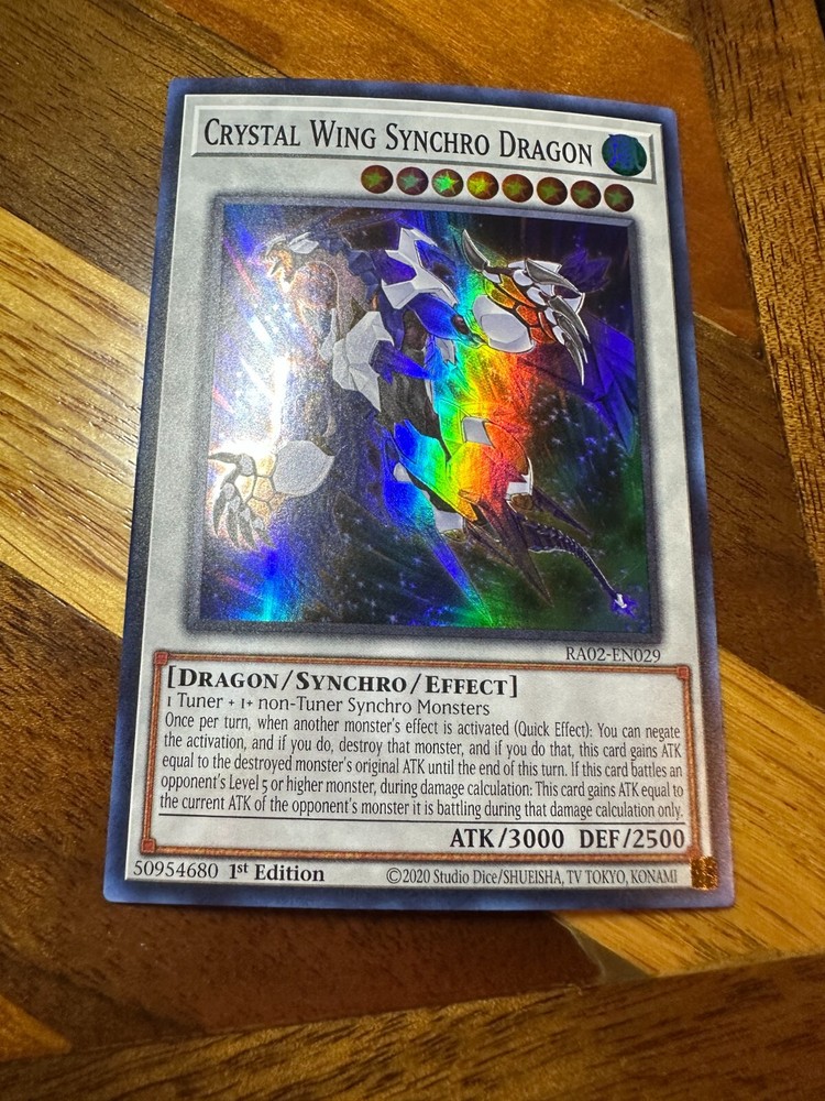 Hello! You are buying one Crystal Wing Synchro Dragon RA02-EN029 1st Edition Super Rare in near-mint c ondition! As a thank you for buying from me, I will throw in two free Yugioh commons! Thank you so much for looking, have a great day! If there is ever an issue, please let me know so I can do whatever I can to resolve it! Please check out my other items! I have many more single cards!
