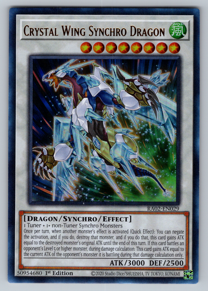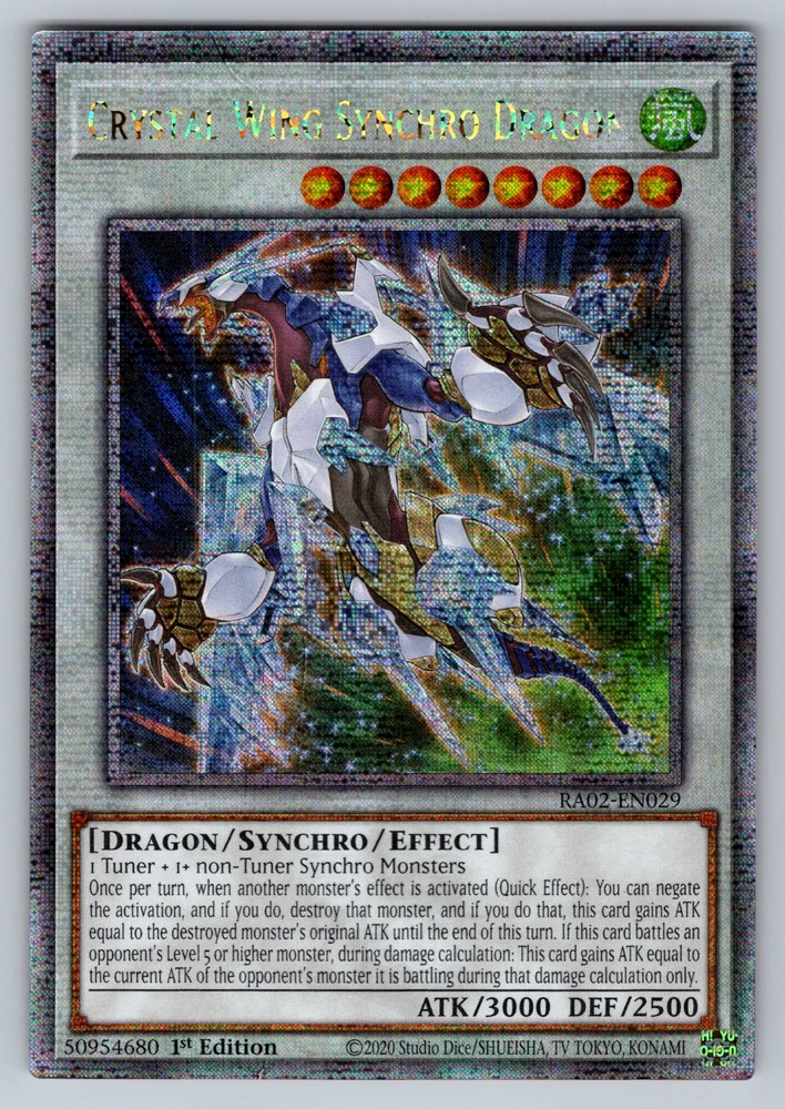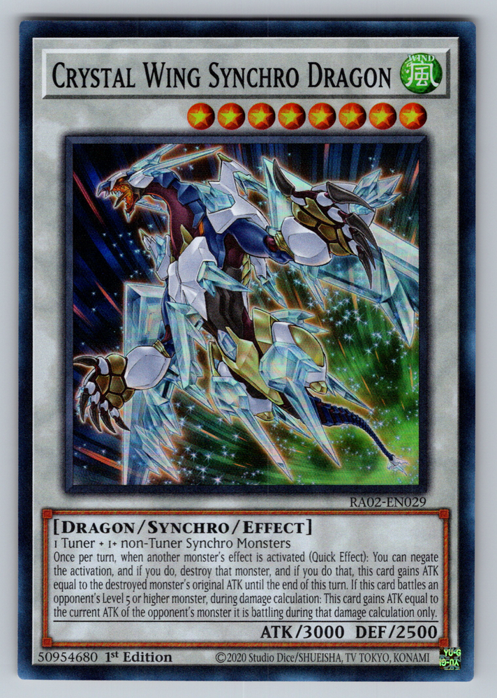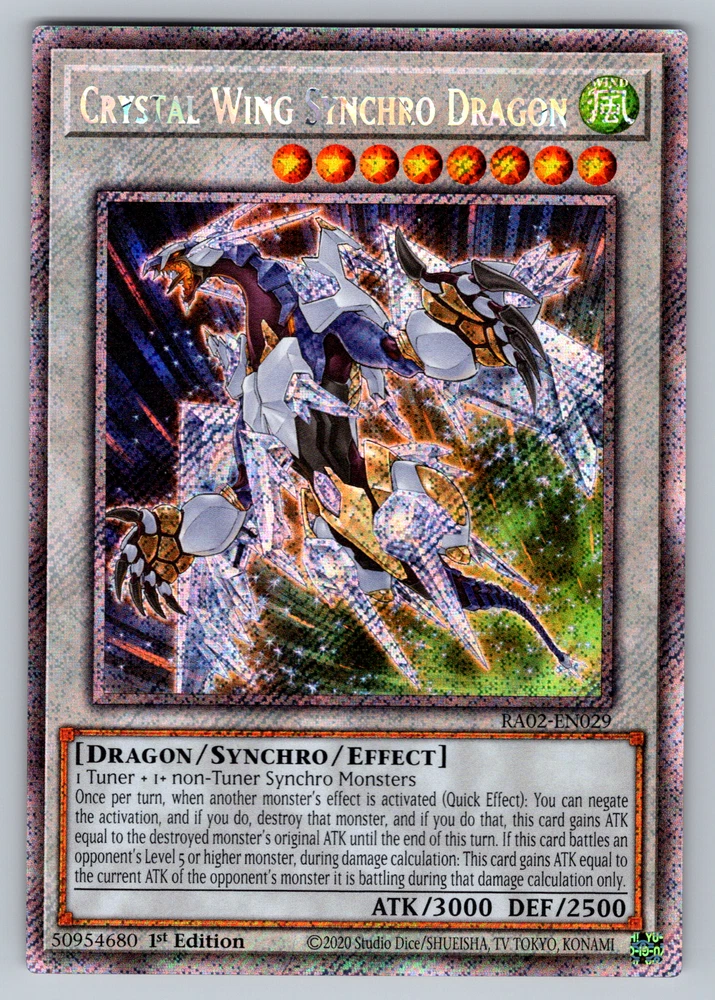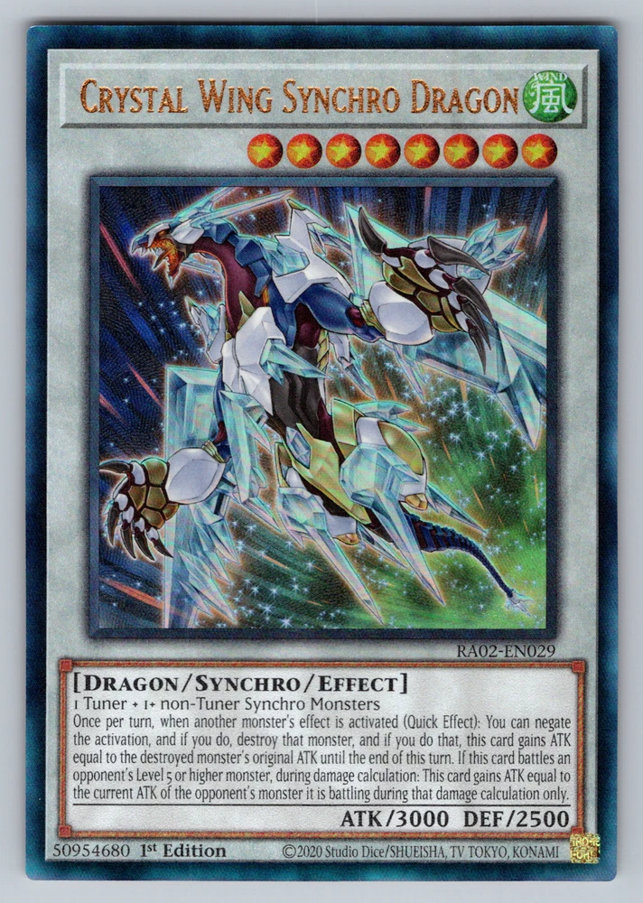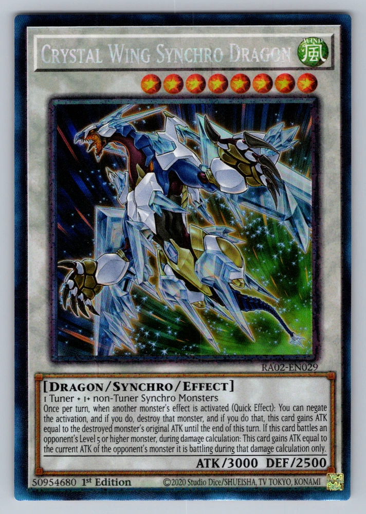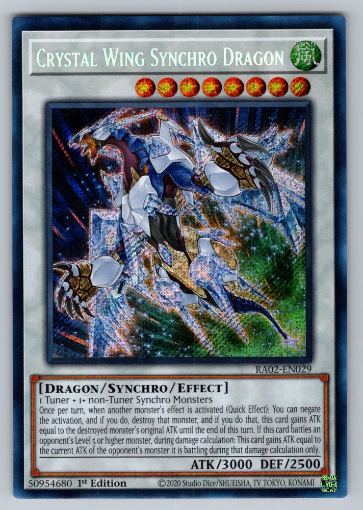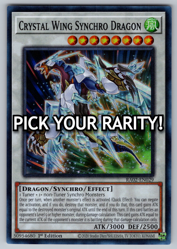 This listing is for Crystal Wing Synchro Dragon - RA02-EN029 from the 25th Anniversary Rarity Collection II set . Each photo in this listing is a stock photo as this is a bulk variation listing. You will receive the same card in the same condition selected , but it may not be the exact copy from the photo . Therefore, centering on the card you receive may differ from the centering of the card listed in the photo. Please be aware of this before purchasing. Each card will be in Near Mint condition. Cards in this listing may have some very minor imperfections (such as few small dots of whitening or a couple of very small scratches), but there will be no major damage to the cards (such as excessive whitening, scratches, edgewear, creases, water damage, etc). The cards from your order will be securely packaged in a card saver and card saver perfect fit sleeve and shipped with the eBay Standard Envelope program for cards under $20. Whether you're looking to power up your deck or add this to your collection, you'll be sure to enjoy this card! Check out our other listings for more Yu-Gi-Oh! cards!