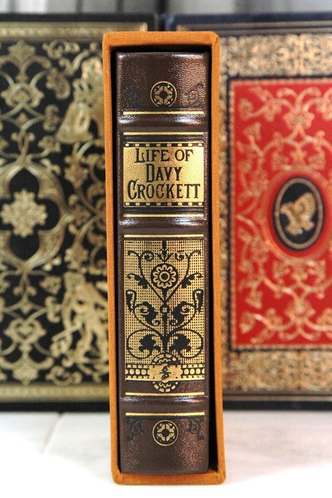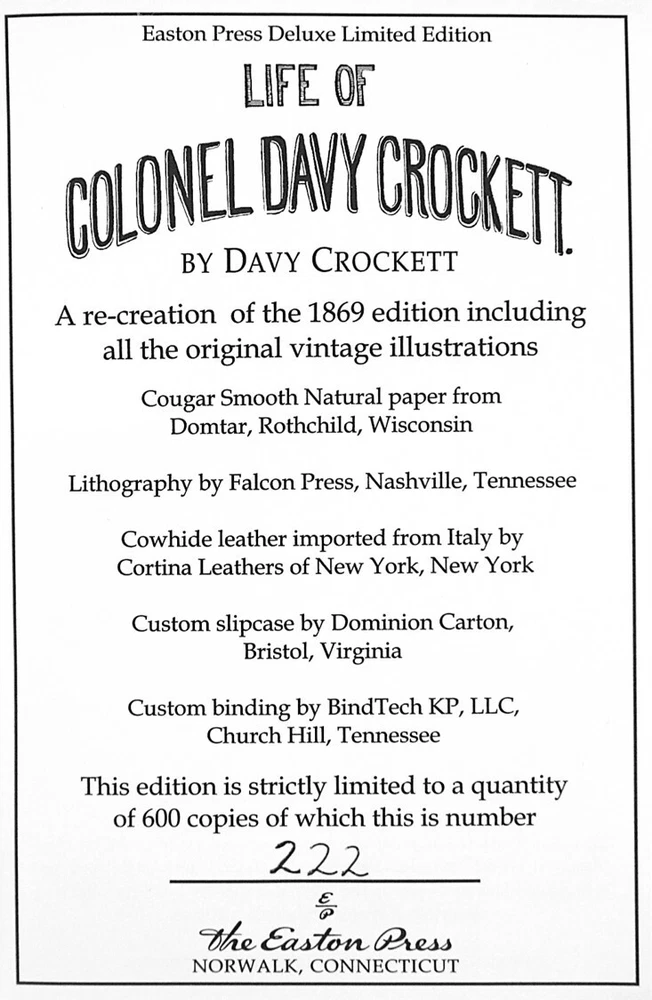 ***Copy of photos, personal formats, graphics, or text is prohibited . Ebay may drop listings with infractions. I review content regularly. Deluxe Limited Edition The Life of Davy Crockett Author: Davy Crockett Illustrations by Description: Limited to just 600 copies, and re-creation of the 1869 first edition! This copy is a very low numbered issue of #222 of the 600. I have very few copies of this title left so now is the time to make your purchase. Condition : New out of plastic. Leather is bright with virtually no sign of shelf wear. Almost no sign of marr to gilt page ends. All my inventory on this title came as seen, out of the plastic directly from the manufacturer and it has not been displayed by any collector. They were likely the last copies Easton Press had and not sealed (though normally they are). I rarely use the description "new out of plastic on EP", but in this case it applies as that's the way they came from manufacturer. The copy shown in the photos is the actual copy to be shipped. This Fine Leather Book Features: Top grade, gold embossed/ornamented leather Gilded page ends to protect against dust and moisture Decorative end papers Acid neutral archival paper to last generations