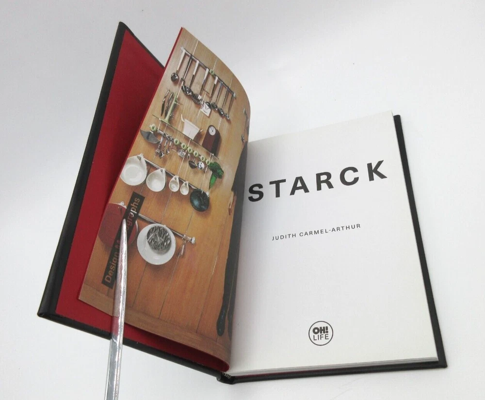 Bound by hand in bonded Leather Professor and post-researcher, Judith Carmel-Arthur Handcrafted 160 pages Size: 5 ⅛" W x 1" D x 7 ½" H A design monograph on architect Philippe Starck, also a ground-breaking designer of furniture, interiors and hotels. Contains a historical-critical essay discussing the life and work of Starck, followed by an illustrated appreciation of his work.