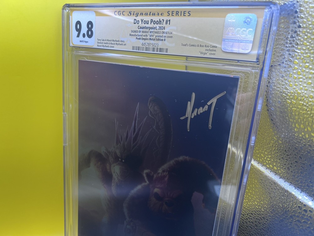 This rare and highly sought-after comic book features the iconic characters Godzilla and King Kong, and is signed by the talented artist Marat Mychaelson. The comic is part of the "Do You Pooh" series and has a grade of 9.8 Near Mint/Mint, ensuring its quality and authenticity. The Metal Edition of this comic book includes a unique Artists Proof- AP5, making it a must-have for any collector or fan of US Comics. Certified by the Certified Guaranty Company (CGC), this comic book is a valuable addition to any collection of comics and graphic novels. Don't miss out on the opportunity to own this one-of-a-kind piece. Personally had it graded. CCXI / XL