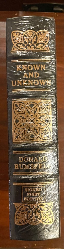 DONALD RUMSFELD SIGNED - KNOWN AND UNKNOWN - EASTON PRESS SEALED FIRST EDITION This is a leather bound signed numbered first edition of Donald Rumsfeld’s best-selling memoir - "Known & Unknown". The book is new, unopened, sealed in Easton Press' original shrink wrap. Signed by the author on the limitation page, it also includes the signed and dated certificate of authenticity, and the publisher's note card. This is a signed copy with all the extras sealed inside. Easton Press books are the golden standard in the publishing industry, highly collectible and lasting generations. Easton Press Full Genuine Leather Dubbed Spine Accented Wit 22 kt. Real Gold Satin Ribbon Page Marker Distinctive Cover Design Gilded Page Edges To Protect Against Humidity High Quality Acid - Free paper Smyth-Sewn Pages Silk-Moire Endleaves