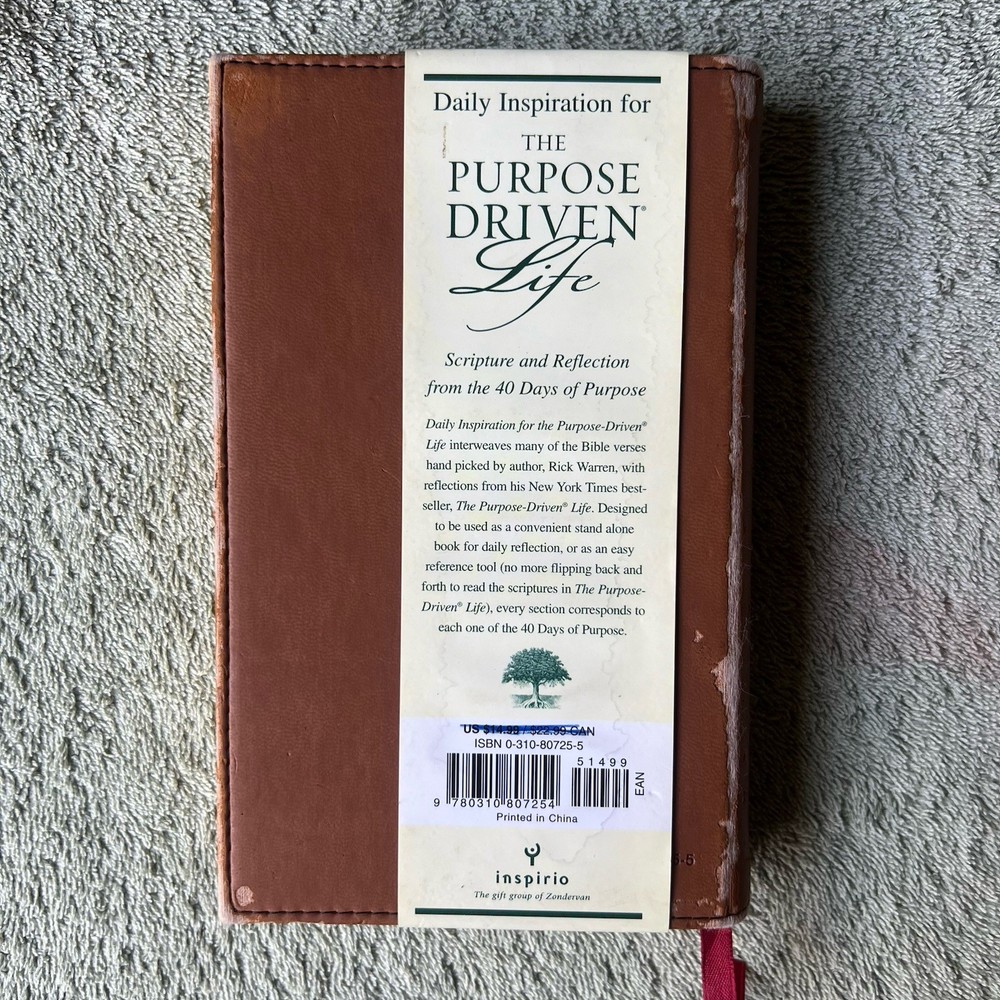 The "Daily Inspiration for the Purpose Driven Life Deluxe Tan" by Rick Warren is a leather-bound book published by Inspirio in 2004. It contains 288 pages of inspirational reflections and biblical meditations aimed at guiding readers towards a more purpose-driven life. This deluxe edition features a compact size of 7 inches in length, 4.4 inches in width, and 1 inch in height, making it a convenient and meaningful addition to any Christian's bookshelf.