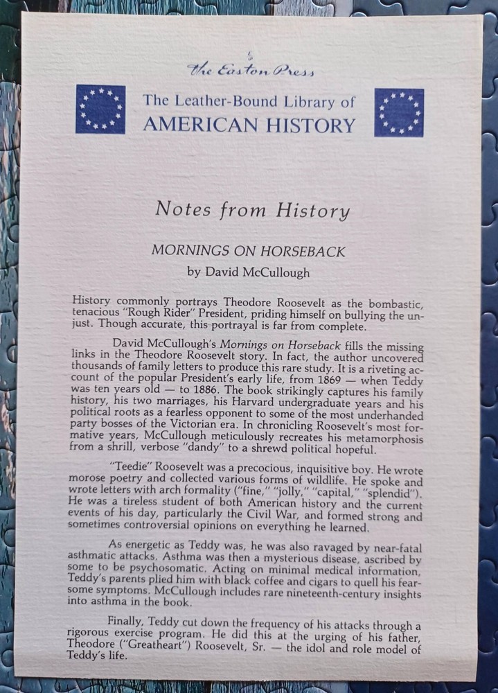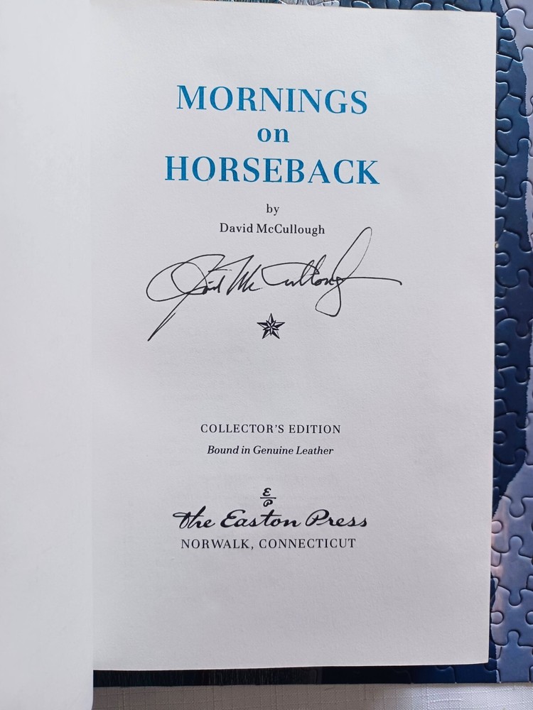 MORNINGS ON HORSEBACK by DAVID MCCULLOUGH SIGNED BY MCCULLOUGH ON THE TITLE PAGE Blue leather binding; ribbed spine with gilt. Gilt edges. Ribbon bookmark. Notes included. Please feel free to look at my other listings of fine and signed books . . .
