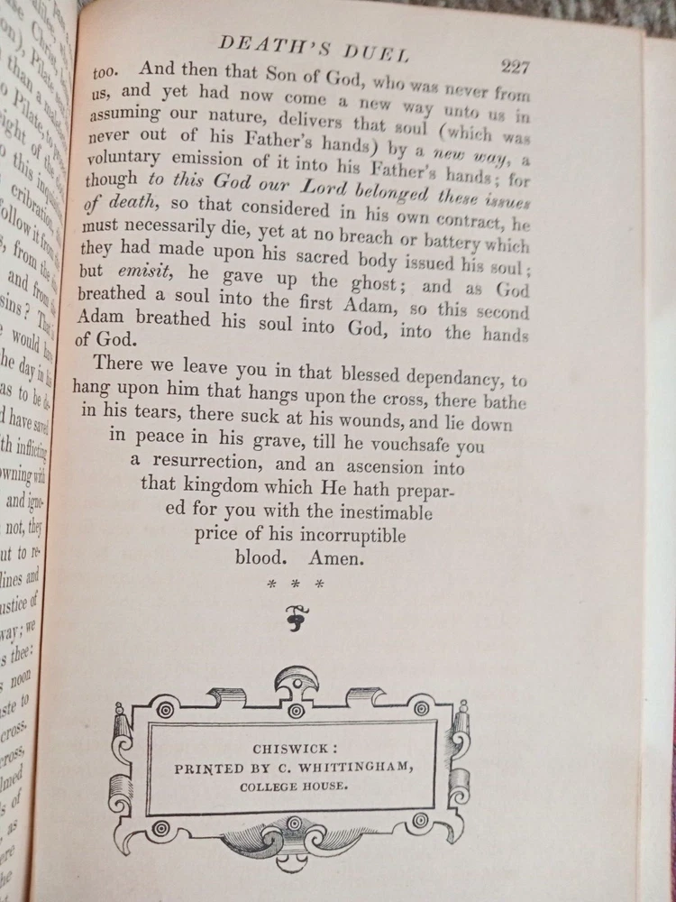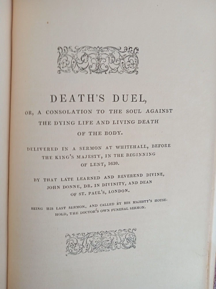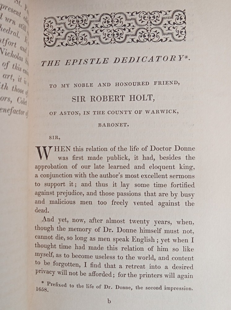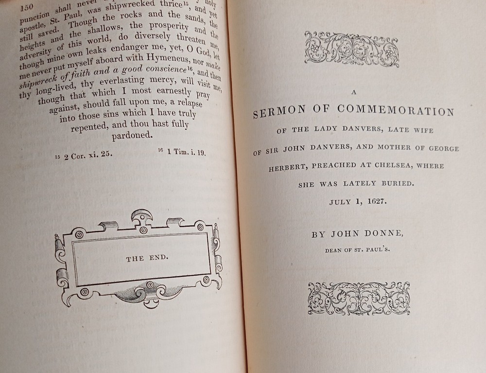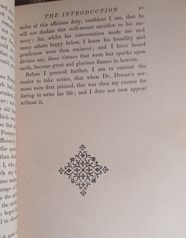 Original 1840 printing of the famed John Donne's (1576-1631) autobiography. The cleric who lived and preached during the English reformation. Introduction by Izaak Walton. Two Sermons titled: -On The Decease of Lady Danvers Mother of Lord Herbert -Deaths Duel -- His Own Funeral Sermon Beautiful ilustrations. Two loose first pages.
