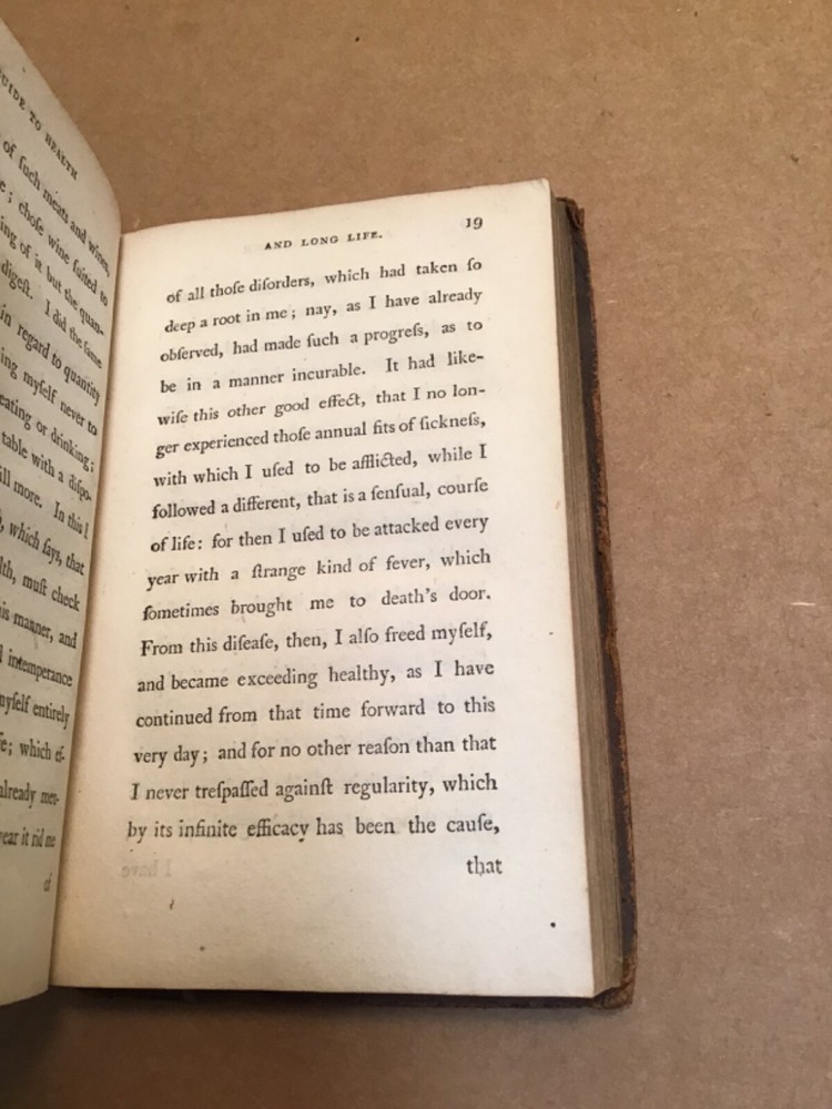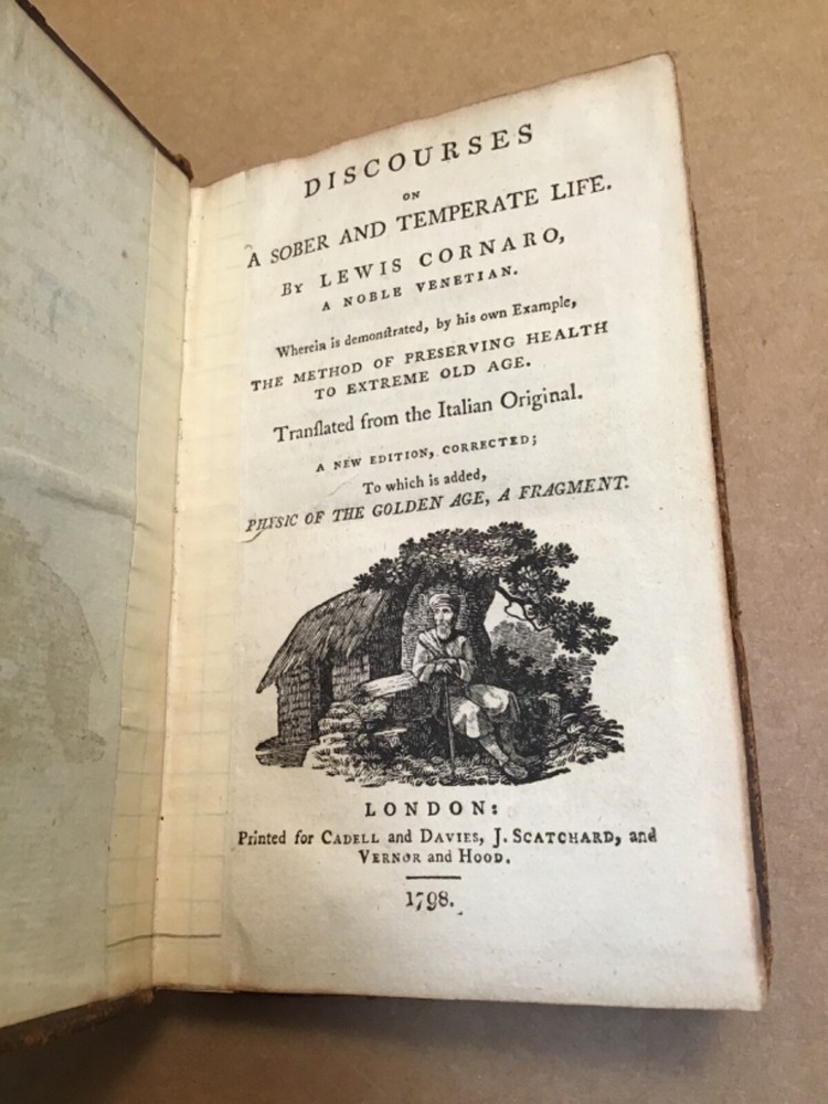 Discourses On A Sober And Temperate Life by Lewis Cornaro “Vest Pocket" size, 5 3/4 inches high.166 pages plus 2 pages publishers advertisements. Printed for Cadell and Davies; J. Scatchard; Vernor and Hood. 1798. Moderation in all things; reduced calorie intake; suggestions as to food choices. Advice that will extend your life, and give you many more years of ebaying. Leather covers. You can see from images that there is some moderate scuffing. The front cover was neatly re-attached at some point with cloth tape; so there is a “crack” along outside hinge. The inside pages are clean, couple corner tips folded. Really “in good condition for its age”, as some sellers like to say. I will pay for boxed shipping to USA mailing addresses. Please email before the last day if you have any questions: I am not always by the computer and sometimes away overnight. Thanks for looking.