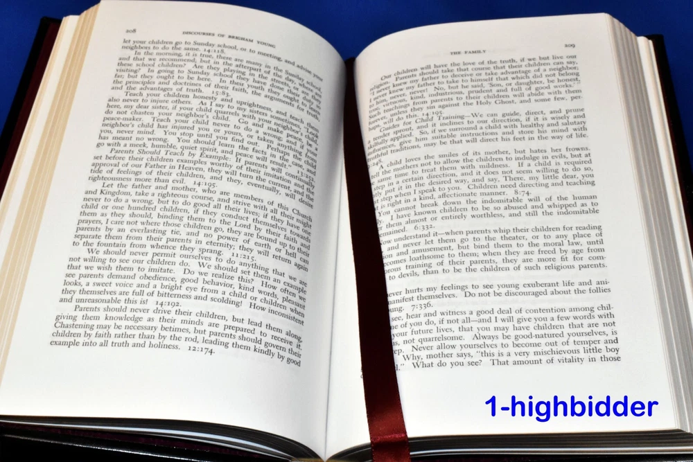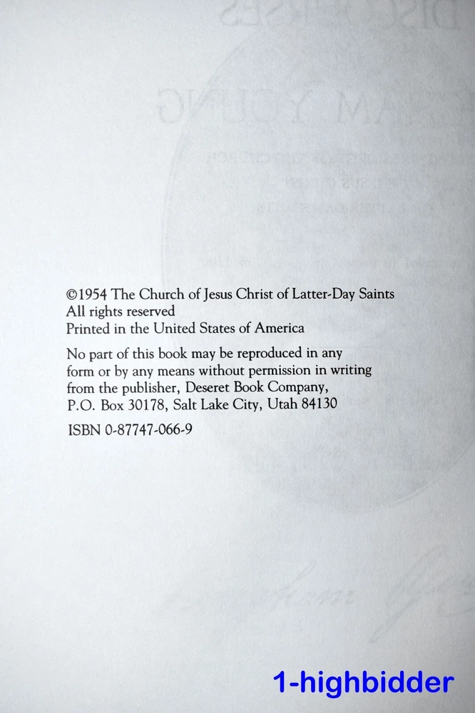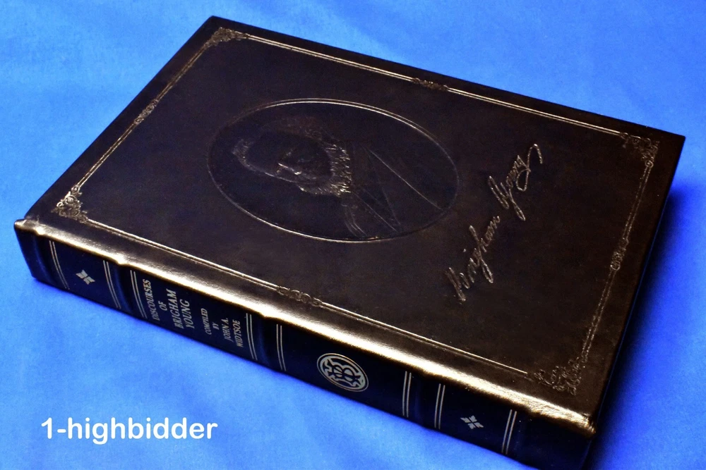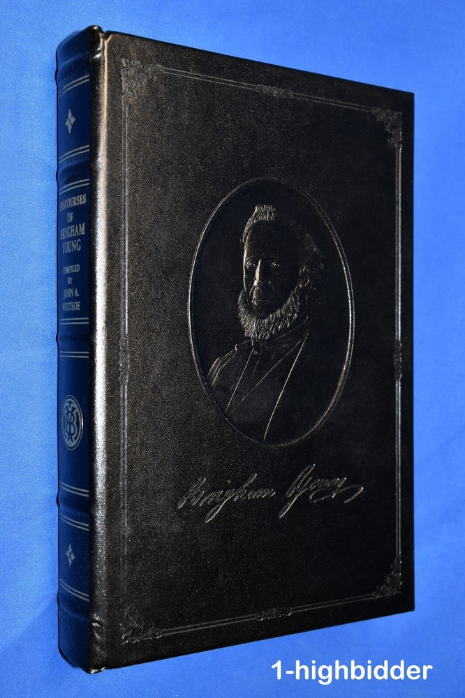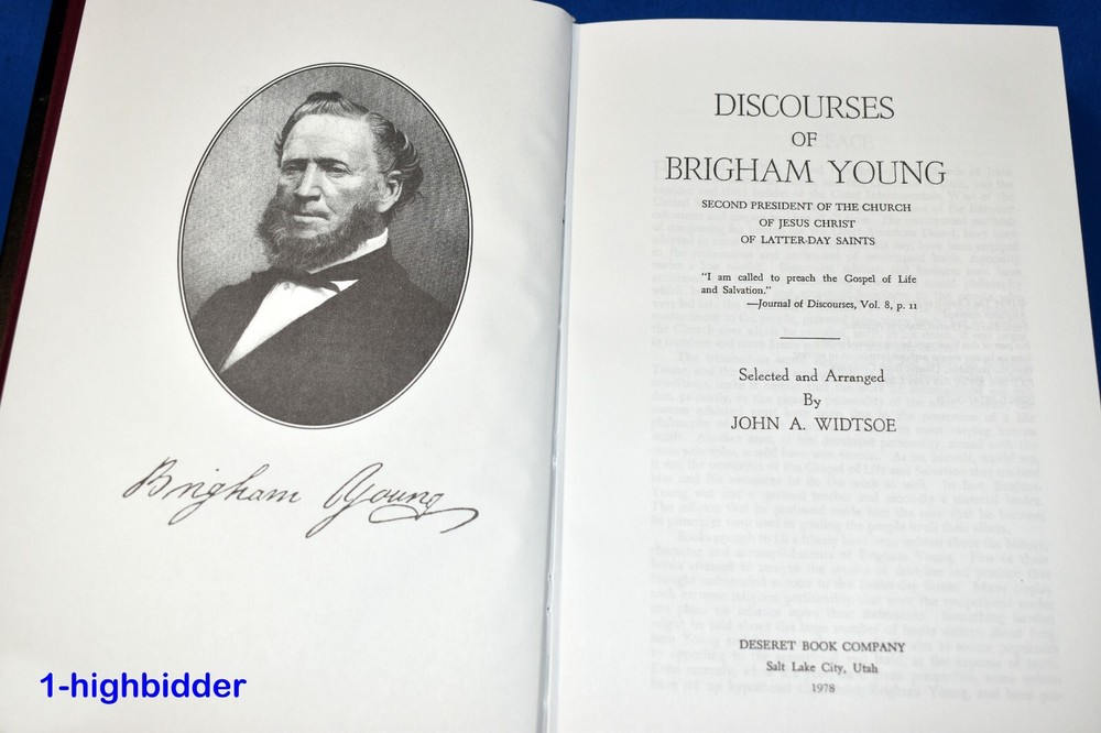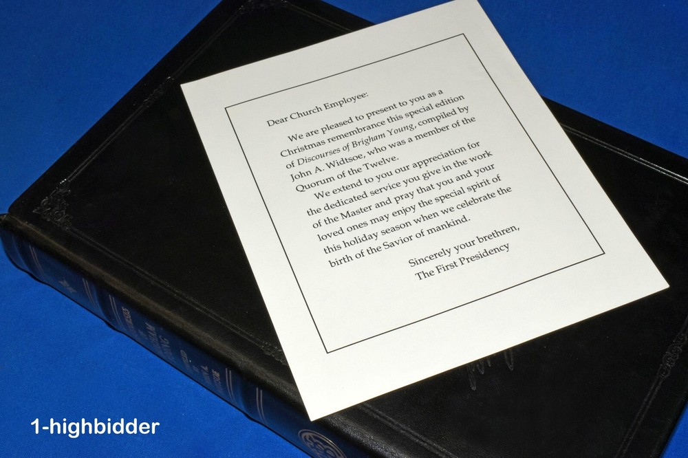 Discourses of Brigham Young by John A Widtsoe LDS Employee Leather Gift Edition __________________________________________ Discourses of Brigham Young Compiled by John A. Widtsoe Published by The Church of Jesus Christ of Latter-day Saints (1992) About the Book: This book was never sold, but is a LDS Church Employee Christmas Gift Edition Bound in beautiful top grain Black Leather, hubbed spine, gold gilt page edges, maroon moiré end pages and a sewn in silk ribbon marker. These were given by The Church of Jesus Christ of Latter-day Saints (the Mormons) to the employees of the Church as a Christmas gift in 1992. The text in this edition is reproduced exactly from the original 1954 edition. Condition: BRAND NEW 1st Thus Edition Hardcover Book! The binding is tight and all 497 pages within are bright white with no writing, underlining, high-lighting, rips, tears, bends, or folds. The covers are perfect, as is the gold gild page edges. The only flaw is that the original cello wrap has been removed. This one even has the rare First Presidency Gift Card inlcuded! Please check out the photos! You will be happy with this one! Always handled carefully and packaged securely! Buy with confidence from a seller who takes the time to show you the details and not use just stock photos. Please check out all my pictures and email with any questions! Thanks for looking! Copyright © 2018-2025 TDM Inc. The photos and text in this listing are copyrighted. I spend lots of time writing up my descriptions and despise it when un-original losers cut and paste my descriptions in as their own. It is against ebay policy and if you are caught, you will be reported to ebay and could be sued for copyright infringement and damages.