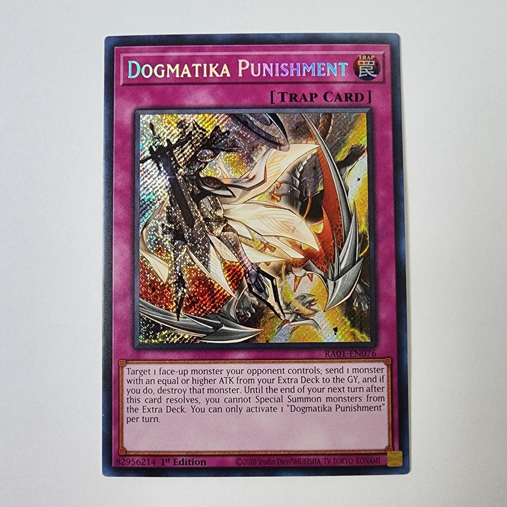 Dogmatika Punishment - RA01-EN076 - Secret Rare - NM - Yugioh TCG 25th Anniversary Rarity Collection Don't forget to click on the store icon for more great deals on singles, playsets, and sealed products.
