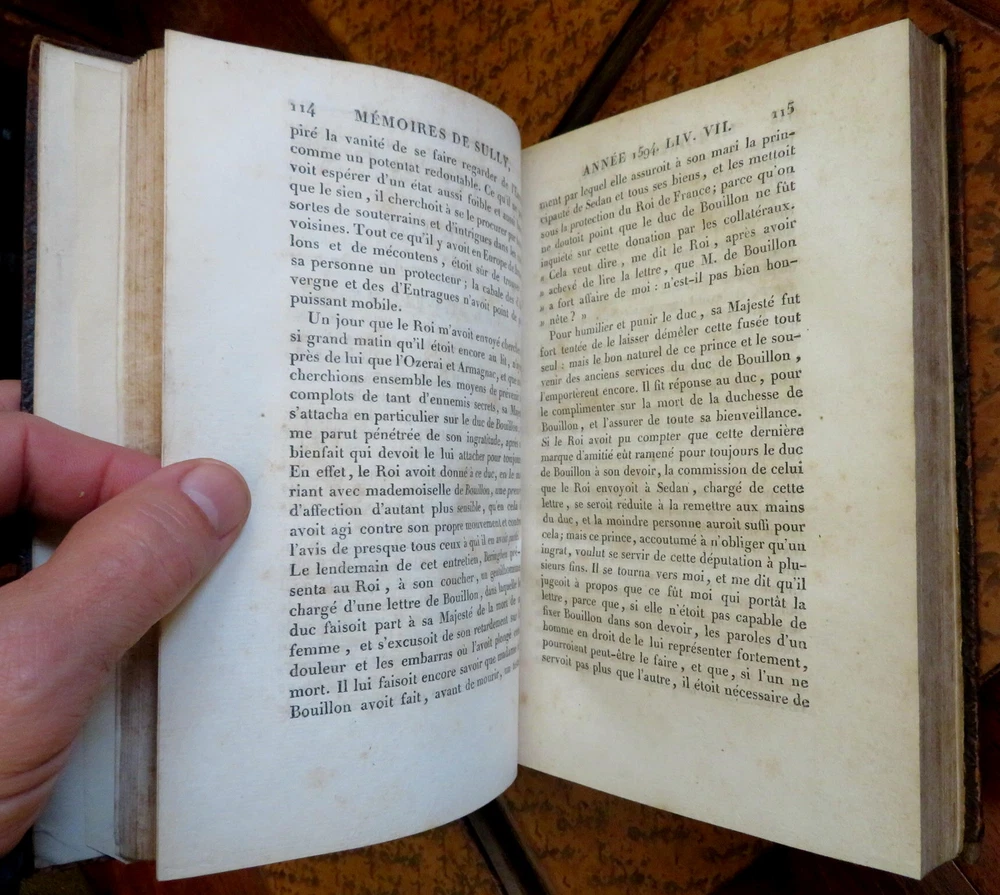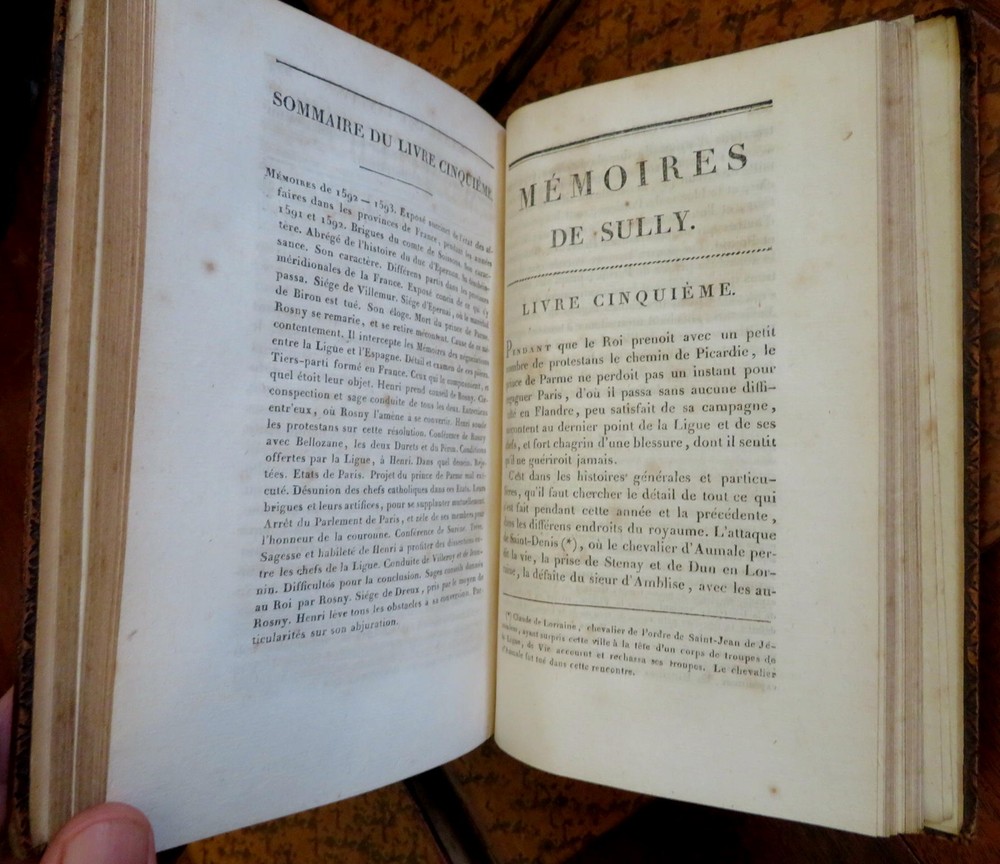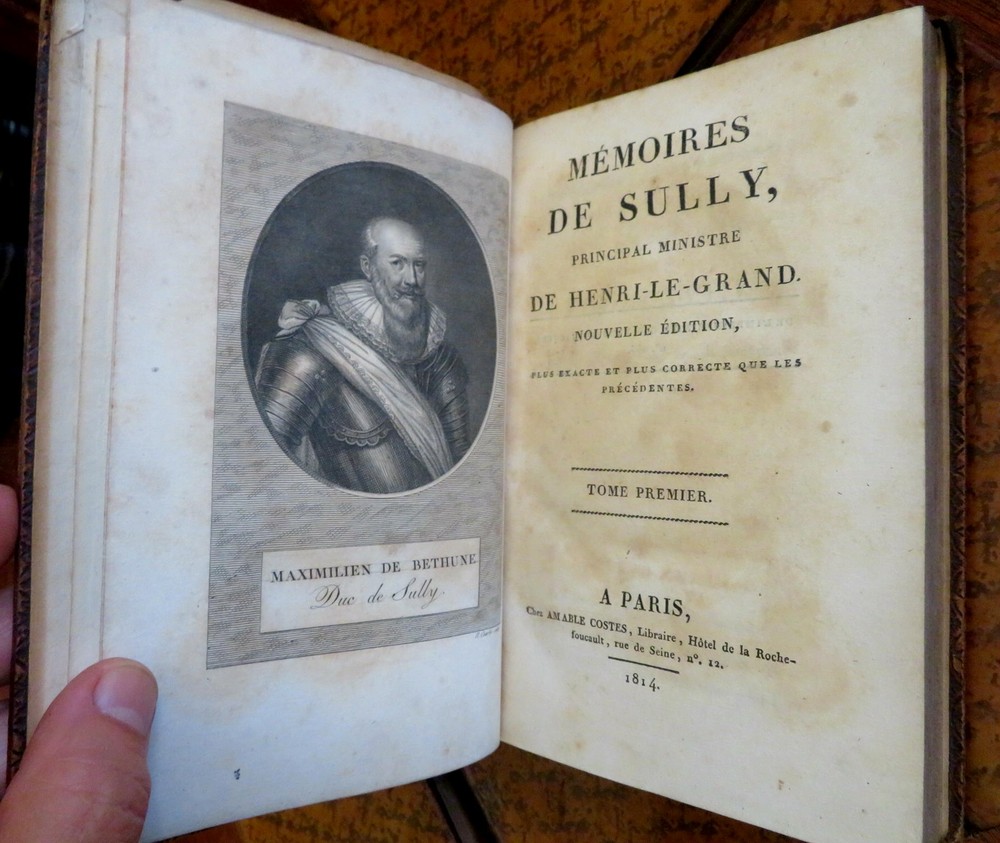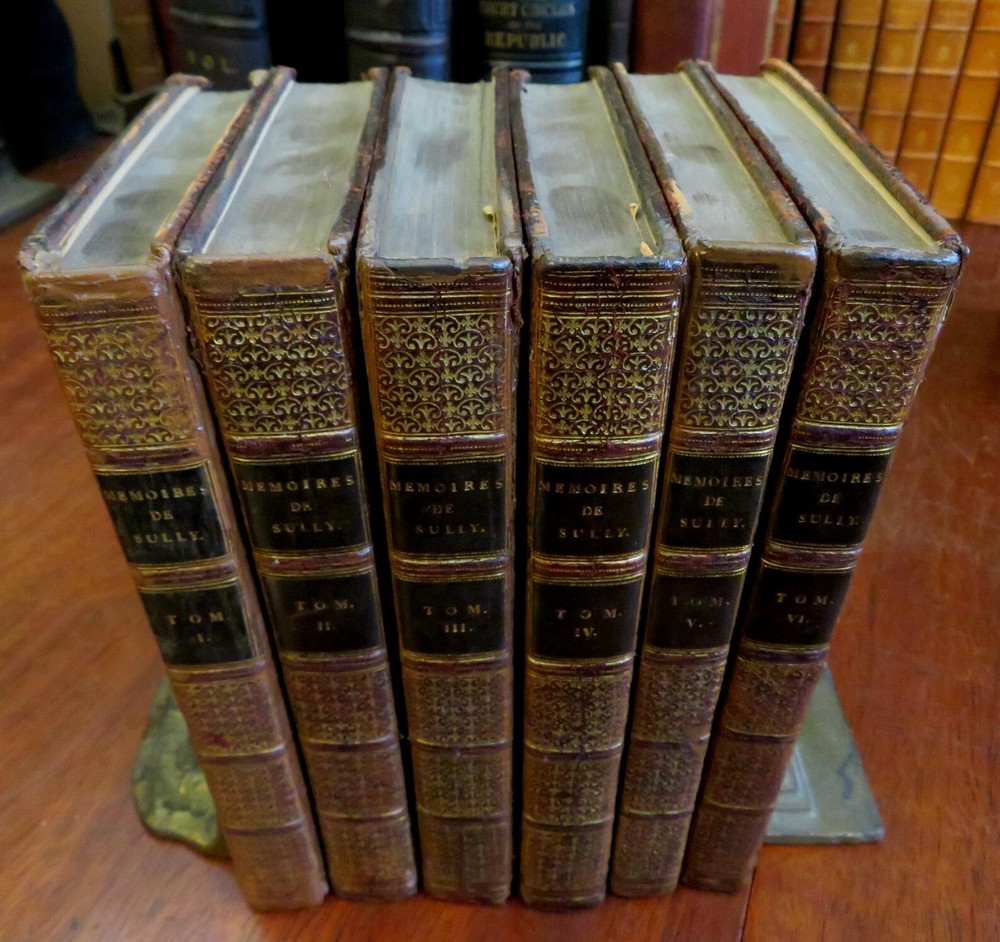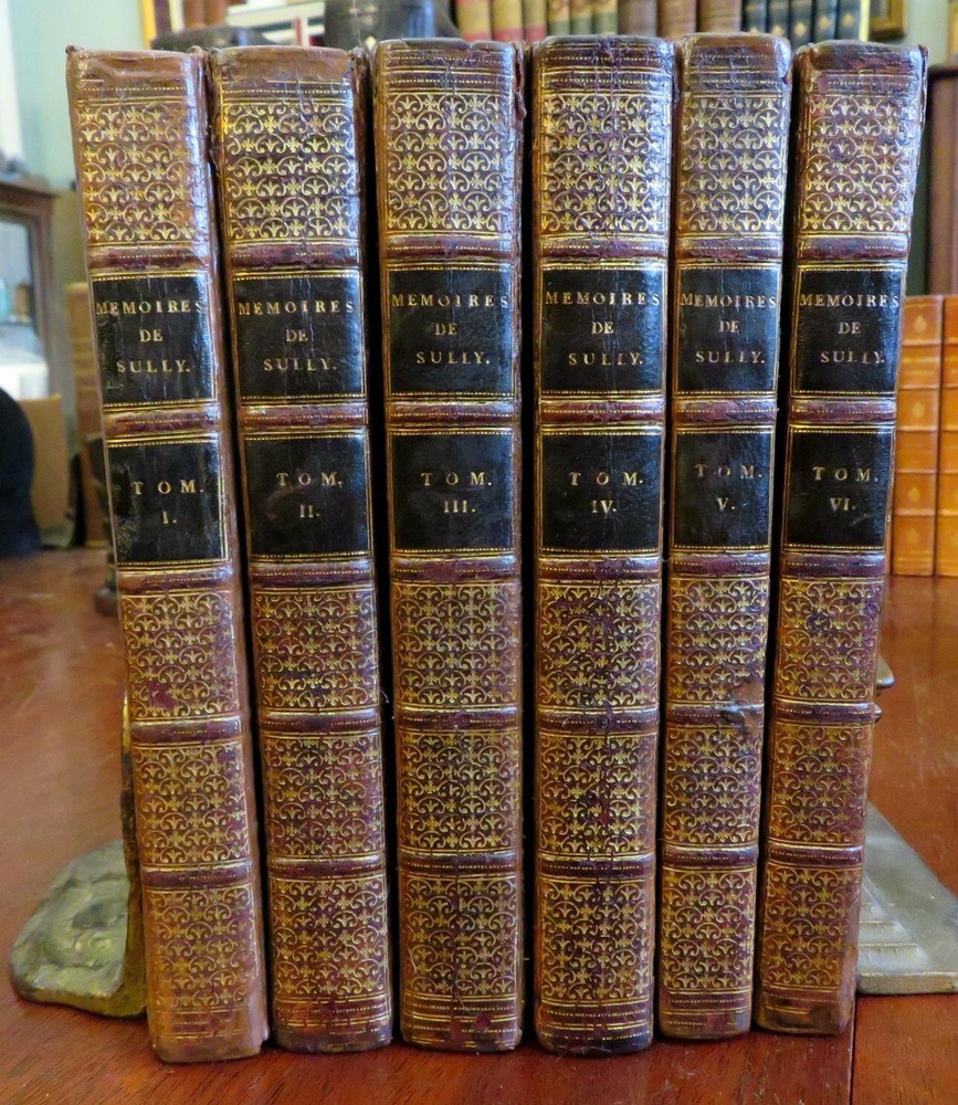 Duke of Sully memoirs 1814 French Statesman Henri-le-Grand leather 6 vol. set Duke of Sully memoirs 1814 French Statesman Henri-le-Grand leather 6 vol. set (Old Books, 19th Century Books, Leather Books, French Books, European History, Memoirs, Maximilien de Bethune, Duke of Sully). Memoires de Sully, Principal Ministre de Henri-Le-Grand. Nouvelle Edition. Published 1814, Paris by Amable Costes. 6 volumes, each c. 375 pages. Text in French. Engraved frontis portrait in volume 1. Attractive full antiquarian leather bindings with mottled boards, slightly raised & gilt bands, gilt title lettering on contrasting leather labels. Set is physically old and shows some signs of handling and time. Bindings age worn and dried but still appealing, leather and joints dried with some surface crackling and small spots of chipping, rubbed but still supple, some joints splitting or tender, set remains overall very attractive as an object. Note- the (internal) hinges of Vol. 1 were repaired long ago with what looks to be cello tape and the joints show evidence of repair as well, but both covers still well and firmly attached. Still a great looking set on a shelf, with outstanding mottled full leather boards. Text block paper is gently age toned as typical, internally set remains mostly clean, tight and sound. A set which has been taken care of but may/ does not look like new. Still attractive on the shelf. Set displays a pleasing and unique age patina and is in rather nice antiquarian condition, any age flaws seem easy to overlook or forgive. Please review photos for more detailed attempt to present this scarce and pleasing antiquarian set as it survives. We often over-describe any flaws that many sellers would not even bother to mention since most people would overlook them as minor and unworthy of comment. Many people tell us the books they receive from us are nicer in person than they appears on the screen. We want you to be clear about what you are buying, so we take numerous photos and try to describe it openly and honestly. Books Measure c. 8" H x 5 1/4" W. [B7411-BR225].