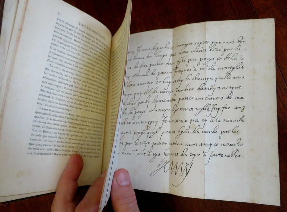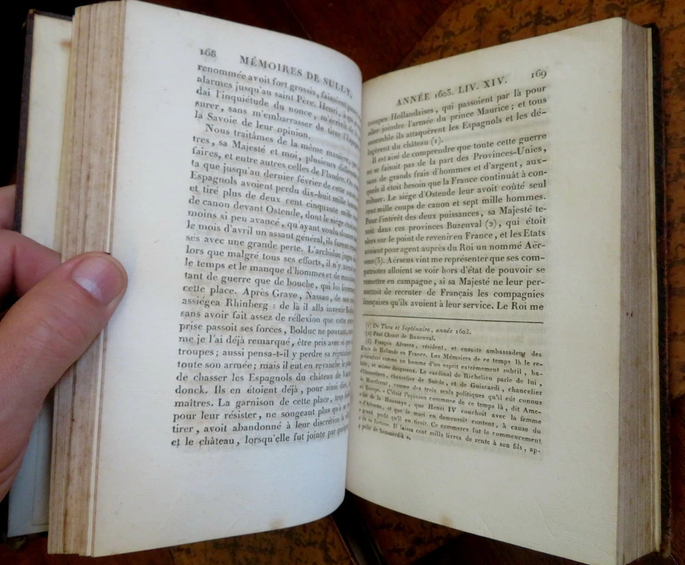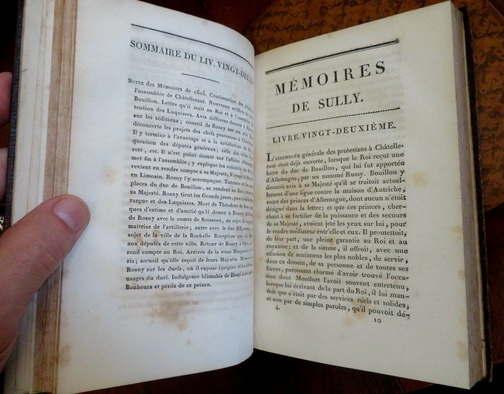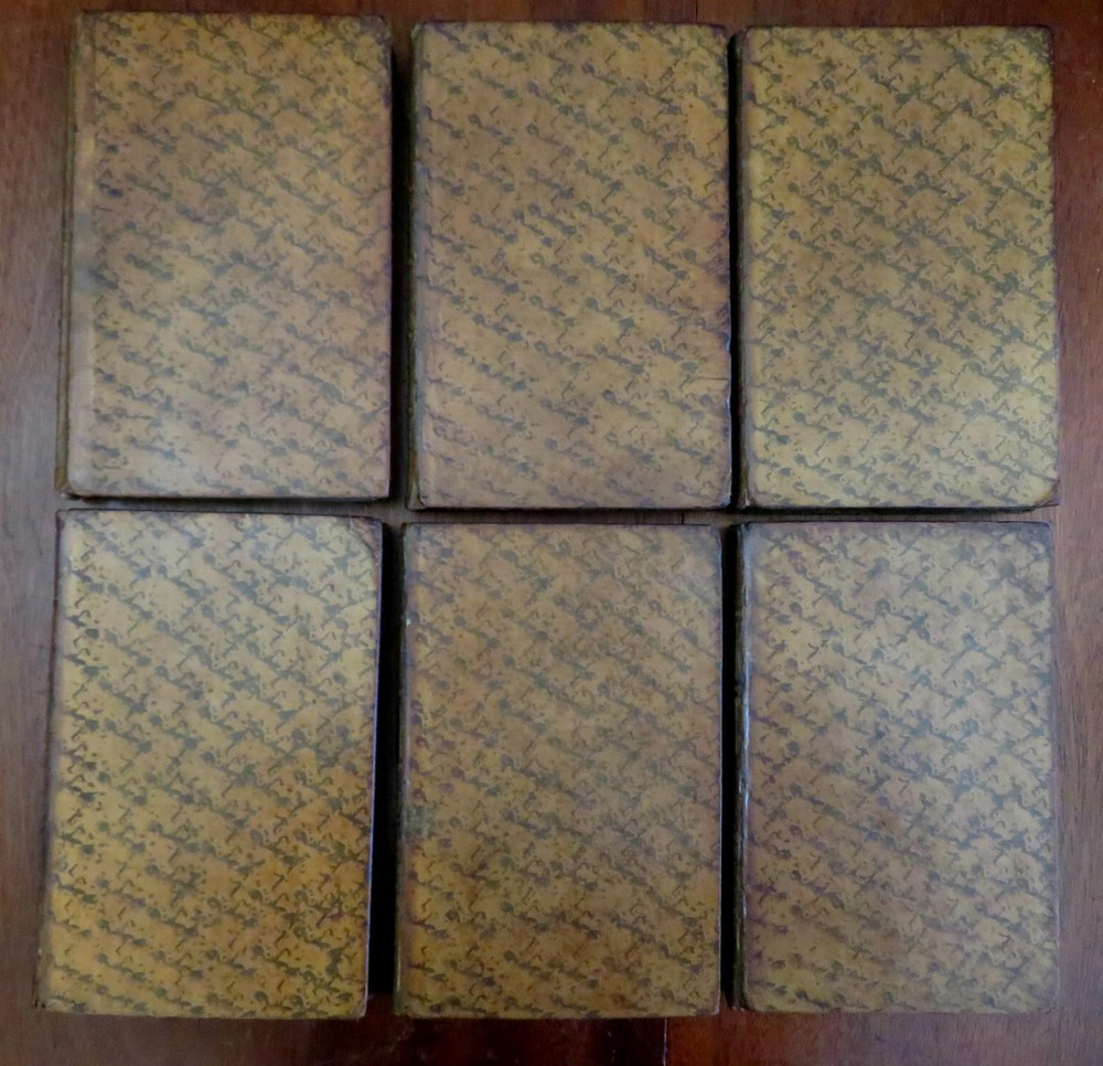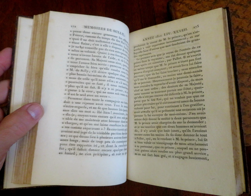Duke of Sully memoirs 1814 French Statesman Henri-le-Grand leather 6 vol. set Duke of Sully memoirs 1814 French Statesman Henri-le-Grand leather 6 vol. set (Old Books, 19th Century Books, Leather Books, French Books, European History, Memoirs, Maximilien de Bethune, Duke of Sully). Memoires de Sully, Principal Ministre de Henri-Le-Grand. Nouvelle Edition. Published 1814, Paris by Amable Costes. 6 volumes, each c. 375 pages. Text in French. Engraved frontis portrait in volume 1. Attractive full antiquarian leather bindings with mottled boards, slightly raised & gilt bands, gilt title lettering on contrasting leather labels. Set is physically old and shows some signs of handling and time. Bindings age worn and dried but still appealing, leather and joints dried with some surface crackling and small spots of chipping, rubbed but still supple, some joints splitting or tender, set remains overall very attractive as an object. Note- the (internal) hinges of Vol. 1 were repaired long ago with what looks to be cello tape and the joints show evidence of repair as well, but both covers still well and firmly attached. Still a great looking set on a shelf, with outstanding mottled full leather boards. Text block paper is gently age toned as typical, internally set remains mostly clean, tight and sound. A set which has been taken care of but may/ does not look like new. Still attractive on the shelf. Set displays a pleasing and unique age patina and is in rather nice antiquarian condition, any age flaws seem easy to overlook or forgive. Please review photos for more detailed attempt to present this scarce and pleasing antiquarian set as it survives. We often over-describe any flaws that many sellers would not even bother to mention since most people would overlook them as minor and unworthy of comment. Many people tell us the books they receive from us are nicer in person than they appears on the screen. We want you to be clear about what you are buying, so we take numerous photos and try to describe it openly and honestly. Books Measure c. 8" H x 5 1/4" W. [B7411-BR225].