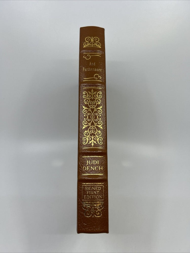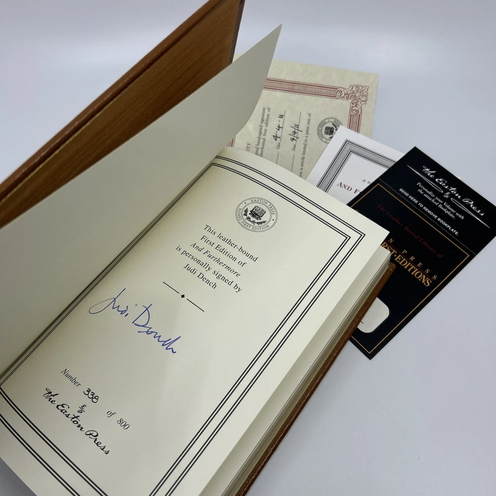This stunning leather-bound Easton Press edition of *And Furthermore* is a must-have for collectors and Judi Dench fans alike! Personally signed by the legendary Dame herself, this rare first edition is beautifully crafted with elegant gilt details. Though showing slight shelf wear, the book remains in excellent condition, complete with its original Certificate of Authenticity. A true gem for any library—don’t miss the chance to own this exclusive piece of cinematic and literary history!