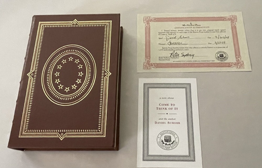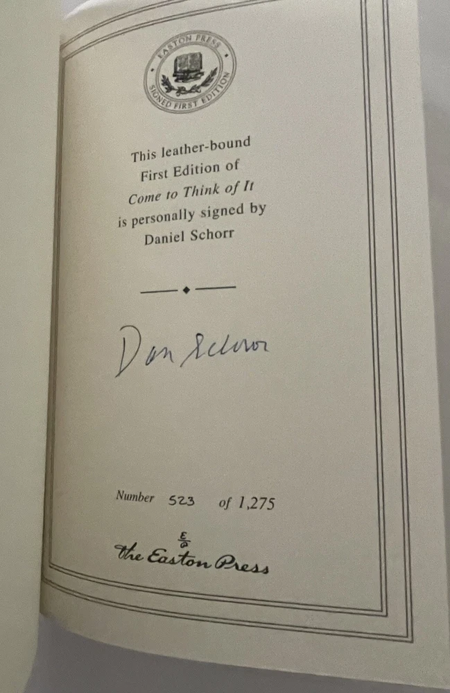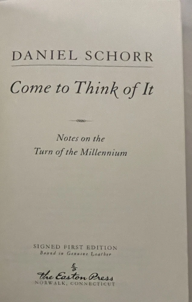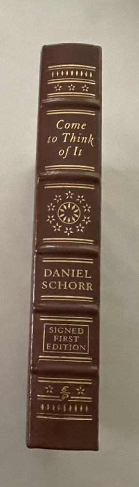 Daniel Schorr: Come to Think of It: Notes on the Turn of the Millennium (SIGNED FIRST EDITION) Easton Press Leatherbound Collector's Edition A volume of unstinting political observations by an analyst for NPR's All Things Considered and Weekend Edition covers such topics as the war in Iraq, health care, and the U.N. report on climate change. Book features full leather binding, 22-kt. gold stamping on the cover and spine, archival paper, a satin ribbon page marker, and all edges gilt. It is signed by the author on a special signature page. Book is in fine condition (faint edgewear, faint wear to gilt on page edges).