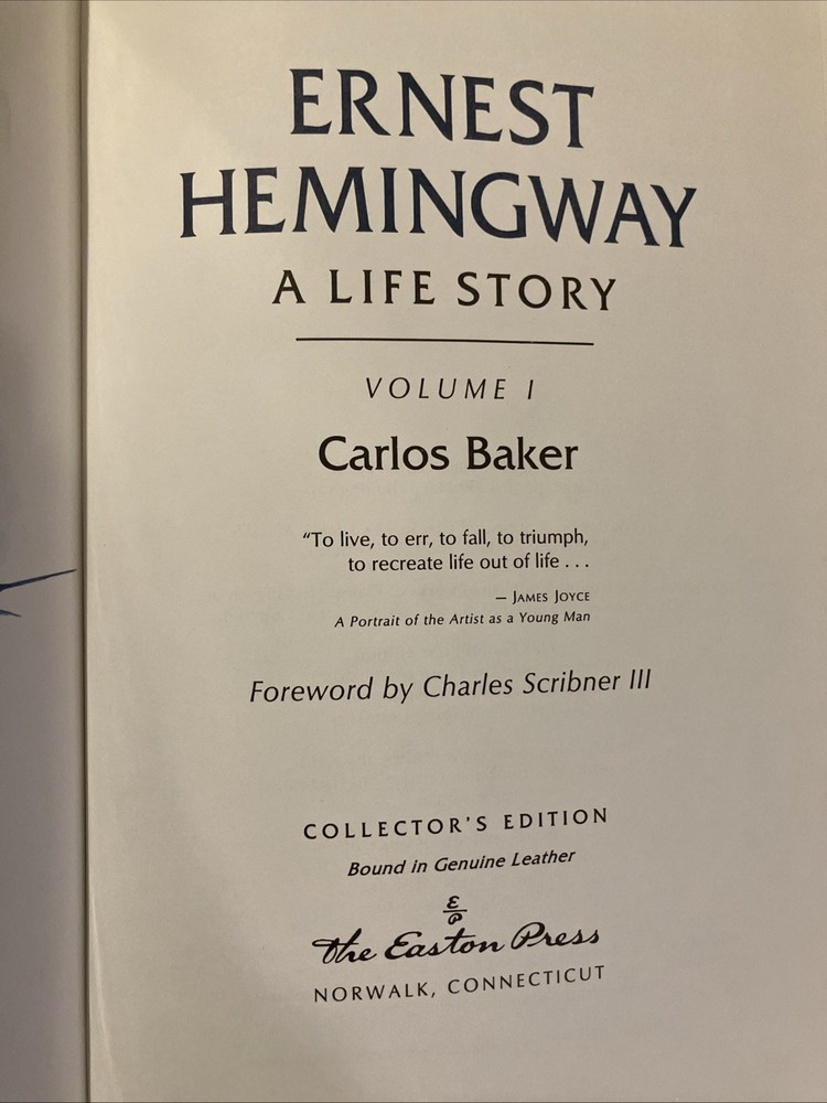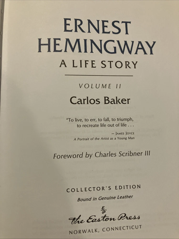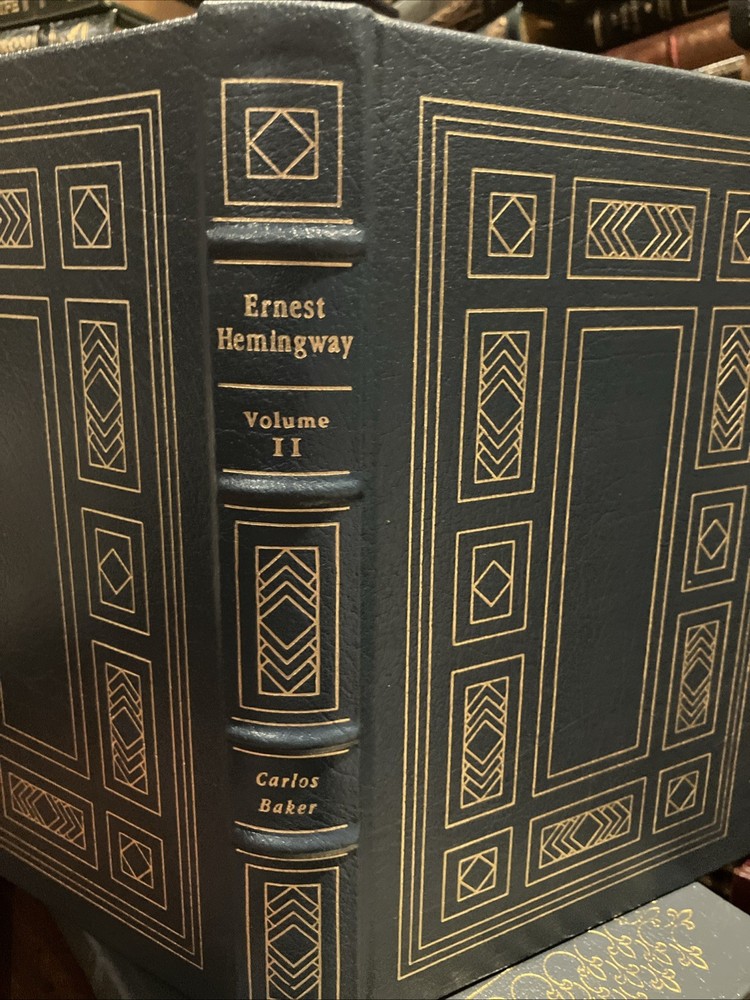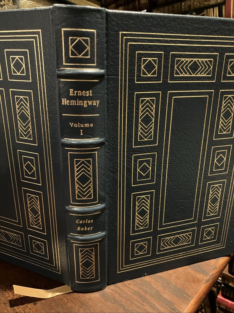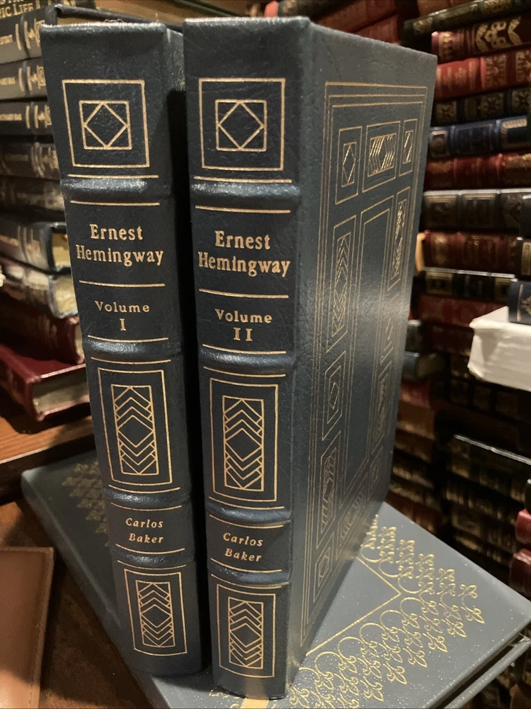 Easton Press leather edition of Carlos Baker's "Ernest Hemingway: A Life Story," Volumes I and II, two COLLECTOR'S editions, Frontispiece portrait of Hemingway, Foreword by CHARLES SCRIBNER, III, one of the LIBRARY OF GREAT LIVES series, published in 1994. Bound in pea green leather, the books have camel tan French moire silk end leaves, acid-free paper, Symth-sewn binding, satin book marker, hubbed spine, gold gilding on three edges---in FINE condition. Ernest Hemingway, who lived from 1899-1961, was born and grew up in Oak Forest, Illionois, the son of a medical doctor and a talented, musically trained mother. His father, Dr. Charles Edmonds Hemingway, took Ernest to the northern woods as soon as it was safe to travel and this became an annual ritual. Ernest loved the Petoskey area where he "played, ate, and slept with a passionate enjoyment." In 1911, Ernest and his sister Marcelline were confirmed in a ceremony at the Third Congregational Church where Grace, their mother, was the choir director and soloist. When Ernest was fourteen, he pitched a tent in Michigan behind the cottage and slept there all summer. One night, he and his friend Harold Sampson stayed up all night reading Bram Stoker's "Dracula" aloud before the cottage fireplace. At Oak Park High School in 1915, Ernest weighed 135, too light for football but in 1916, he began boxing and report writing, averaging a story a week. Many stories dealt with sports. College, war, and work were the choices that confronted him after high school graduation. Ernest chose work and moved to Kansas City and began writing for the STAR. In 1917, Ernest enlisted in the American Field Service and spent four months driving ambulances in France. He later arrived in Italy where again he drove ambulances. "Milan itself was busy and crowded with men in uniform. La Scala was open and there were daily races at the San Siro track." Ernest took turns at the wheel of a lumbering Fiat, a clumsy battleship gray with a large red cross of top. On July 8, Ernest was severely wounded. . .I heard somebody crying. I tried to move but I could not move. "I head the machine gun and rifles firing across the river." His legs felt as if he were wearing rubber boots filled with warm water. "He lay for two hours, waiting and praying. The little Florentine priest came along the line of wounded men, murmuring holy words, anointing each as he passed." In the Italian hospital, Ernest fell "in love" with his nurse, AGNES KUROWSKY, and their love affair would be written about in "A Farewell to Arms." For the first time in his life, he discovered that he was attractive to women. The nurses "liked to exhibit him to visitors as their prize specimen of a wounded hero." Most of his adolescent awkwardness was gone; he had become quite handsome and distinctively masculine with his hairy chest, chiseled pecs and abs, broad shoulders, good jaw, ruddy complexion and full head of dark hair. The older women adopted, mothered, and worshipped him while the younger women were aware of his sexuality. By the middle of August, Ernest was "wildly" in love with Agnes von Kurowsky. By September 11, Ernest could get around the streets of Milan with a cane or on crutches. Agnes informed him she would not be in Milano for their first Christmas. When Ernest returned to the U.S., his father and Marcelline met Ernest in Chicago. Within a month, Ernest was homesick for Italy. He received a letter from Agnes that she was working but moving on with her life. Ernest visited the Upper Península of Michigan, and this gave him the background for "Big Two-Hearted River," the story of Nick Adams on a long hiking-and-fishing expedition to recuperate from the effects of his wounding in the war. In 1920, Ernest met HADLEY RICHARSON, twenty-eight, a tall girl with auburn hair. Hadley was smitten with the "hulky, bulky, something masculine, Ernest Hemingway." Hadley thought he liked her for her "red hair, her skirt was a good length, and she played nicely on Doodles's piano." Despite the eight-year discrepancy in their ages, Ernest and Hadley married, living on the income from her trust fund when they decided to move to Paris where Ernest would write articles for the Toronto Star. Ernest "danced and sang, shadow-boxed and shouted" as he set forth on his second voyage to Europe. In Paris, he met Ezra Pound, Sylvia Beach, F. Scott Fitzgerald, James Joyce, and GERTRUDE STEIN. Ernest and Hadley enjoyed visiting Gertrude and her mate, Alice B. Toklas, in Gertrude's salon. Gertrude became the godmother to the Hemingway's first son, John (Bumby.) In Paris, Ernest and Hadley met Pauline Pfeiffer, a recent Missouri University journalism major who had arrived in Paris on assignment to write magazine articles. Within a few months, Pauline and Ernest had begun an affair and when Hadley confronted Ernest, he admitted the sexual affair but blamed Hadley for "bringing it out in the open." Ernest claimed to love both women. Ernest always said he never stopped loving Hadley and that she was a 'fine woman.' Hadley said if Ernest and Pauline would stay separate for six months and Ernest still wanted a divorce, she would agree. Pauline returned to her parents' home in PIGGOTT, ARKANSAS. She waited a few days to tell her mother that she planned to marry a man who had a wife and a small child. Mary Pfeiffer, a devout Catholic, is said to have "fainted." The Pfeiffers owned 60,000 acres of rich Arkansas farmland. Reluctantly, the Pfeiffers agreed to the marriage---but only because Ernest had his first marriage annulled. Hadley shared their son, Bumby, with Ernest and Jack spent most summers in the U.S., visiting the Pfeiffers in Arkansas with his brothers , Patrick and Gregory. Pauline devoted her life to Ernest, leaving the children with her Arkansas parents and following him to Wyoming and later to Africa on a safari. Pauline's wealthy Uncle Gus Pfeiffer doted on his niece and immediately like Ernest. Uncle Gus bought the KEY WEST, FL