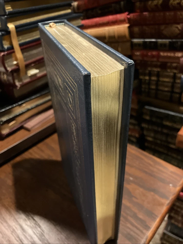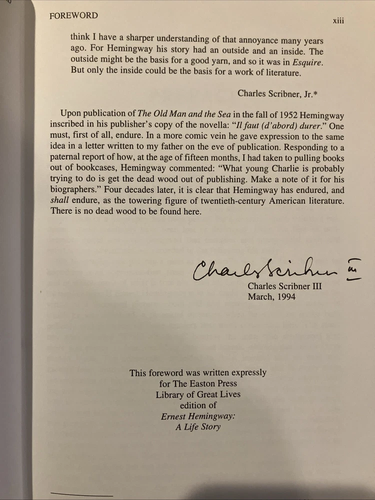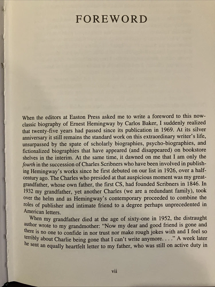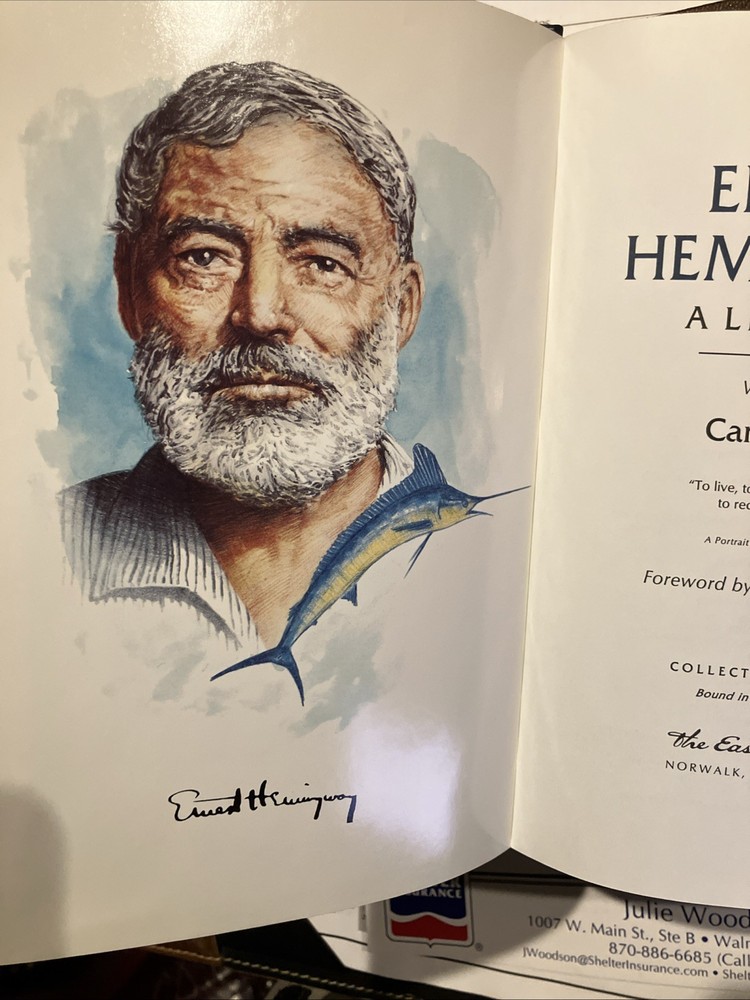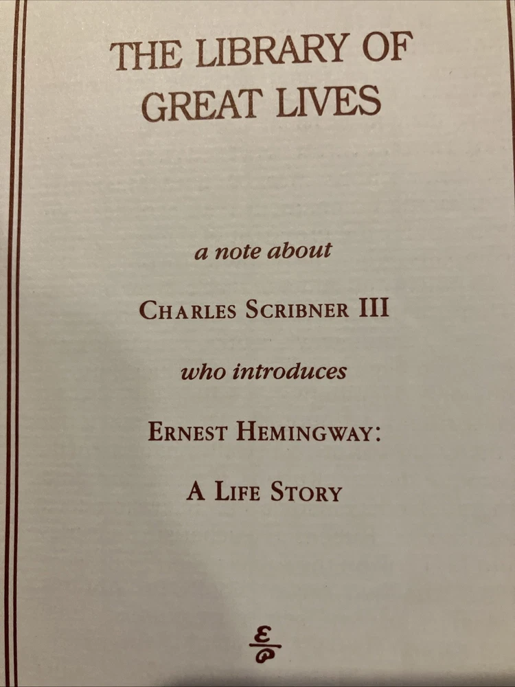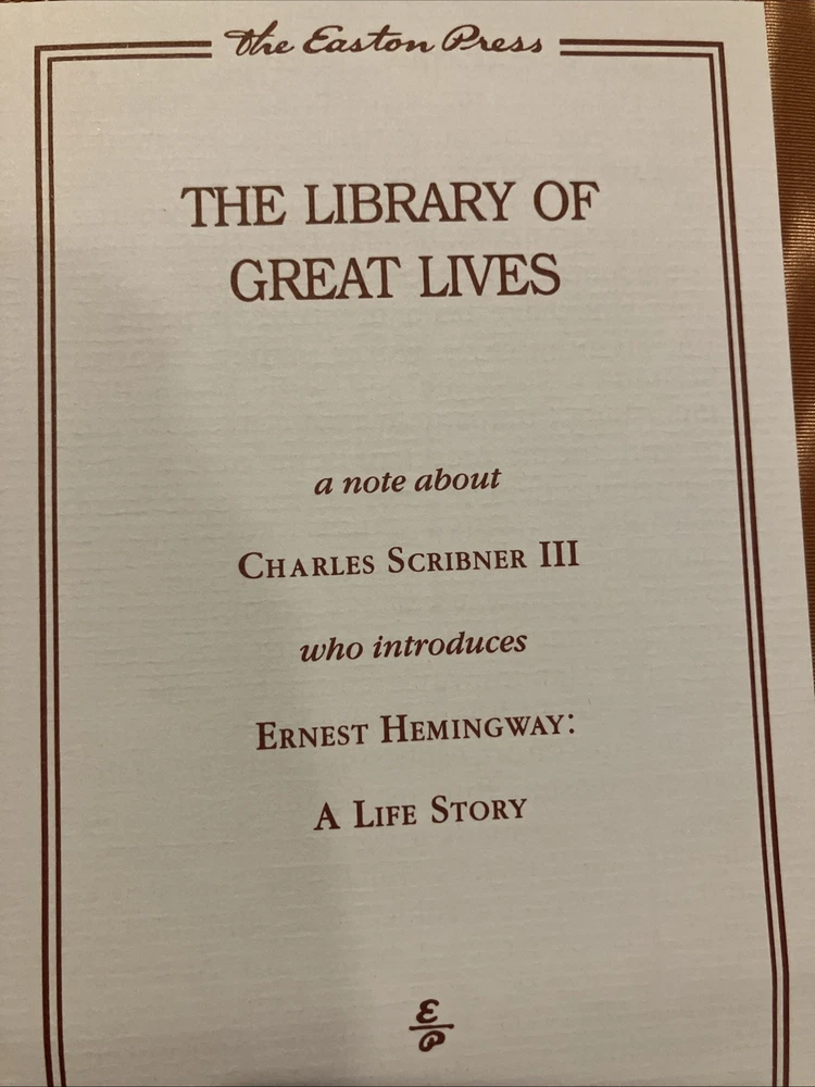 Easton Press leather edition of Carlos Baker's "Ernest Hemingway: A Life Story," Volumes I and II, two COLLECTOR'S editions, Frontispiece portrait of Hemingway, Foreword by CHARLES SCRIBNER, III, one of the LIBRARY OF GREAT LIVES series, published in 1994. Bound in pea green leather, the books have camel tan French moire silk end leaves, acid-free paper, Symth-sewn binding, satin book marker, hubbed spine, gold gilding on three edges---in FINE condition. Ernest Hemingway, who lived from 1899-1961, was born and grew up in Oak Forest, Illionois, the son of a medical doctor and a talented, musically trained mother. His father, Dr. Charles Edmonds Hemingway, took Ernest to the northern woods as soon as it was safe to travel and this became an annual ritual. Ernest loved the Petoskey area where he "played, ate, and slept with a passionate enjoyment." In 1911, Ernest and his sister Marcelline were confirmed in a ceremony at the Third Congregational Church where Grace, their mother, was the choir director and soloist. When Ernest was fourteen, he pitched a tent in Michigan behind the cottage and slept there all summer. One night, he and his friend Harold Sampson stayed up all night reading Bram Stoker's "Dracula" aloud before the cottage fireplace. At Oak Park High School in 1915, Ernest weighed 135, too light for football but in 1916, he began boxing and report writing, averaging a story a week. Many stories dealt with sports. College, war, and work were the choices that confronted him after high school graduation. Ernest chose work and moved to Kansas City and began writing for the STAR. In 1917, Ernest enlisted in the American Field Service and spent four months driving ambulances in France. He later arrived in Italy where again he drove ambulances. "Milan itself was busy and crowded with men in uniform. La Scala was open and there were daily races at the San Siro track." Ernest took turns at the wheel of a lumbering Fiat, a clumsy battleship gray with a large red cross of top. On July 8, Ernest was severely wounded. . .I heard somebody crying. I tried to move but I could not move. "I head the machine gun and rifles firing across the river." His legs felt as if he were wearing rubber boots filled with warm water. "He lay for two hours, waiting and praying. The little Florentine priest came along the line of wounded men, murmuring holy words, anointing each as he passed." In the Italian hospital, Ernest fell "in love" with his nurse, AGNES KUROWSKY, and their love affair would be written about in "A Farewell to Arms." For the first time in his life, he discovered that he was attractive to women. The nurses "liked to exhibit him to visitors as their prize specimen of a wounded hero." Most of his adolescent awkwardness was gone; he had become quite handsome and distinctively masculine with his hairy chest, chiseled pecs and abs, broad shoulders, good jaw, ruddy complexion and full head of dark hair. The older women adopted, mothered, and worshipped him while the younger women were aware of his sexuality. By the middle of August, Ernest was "wildly" in love with Agnes von Kurowsky. By September 11, Ernest could get around the streets of Milan with a cane or on crutches. Agnes informed him she would not be in Milano for their first Christmas. When Ernest returned to the U.S., his father and Marcelline met Ernest in Chicago. Within a month, Ernest was homesick for Italy. He received a letter from Agnes that she was working but moving on with her life. Ernest visited the Upper Península of Michigan, and this gave him the background for "Big Two-Hearted River," the story of Nick Adams on a long hiking-and-fishing expedition to recuperate from the effects of his wounding in the war. In 1920, Ernest met HADLEY RICHARSON, twenty-eight, a tall girl with auburn hair. Hadley was smitten with the "hulky, bulky, something masculine, Ernest Hemingway." Hadley thought he liked her for her "red hair, her skirt was a good length, and she played nicely on Doodles's piano." Despite the eight-year discrepancy in their ages, Ernest and Hadley married, living on the income from her trust fund when they decided to move to Paris where Ernest would write articles for the Toronto Star. Ernest "danced and sang, shadow-boxed and shouted" as he set forth on his second voyage to Europe. In Paris, he met Ezra Pound, Sylvia Beach, F. Scott Fitzgerald, James Joyce, and GERTRUDE STEIN. Ernest and Hadley enjoyed visiting Gertrude and her mate, Alice B. Toklas, in Gertrude's salon. Gertrude became the godmother to the Hemingway's first son, John (Bumby.) In Paris, Ernest and Hadley met Pauline Pfeiffer, a recent Missouri University journalism major who had arrived in Paris on assignment to write magazine articles. Within a few months, Pauline and Ernest had begun an affair and when Hadley confronted Ernest, he admitted the sexual affair but blamed Hadley for "bringing it out in the open." Ernest claimed to love both women. Ernest always said he never stopped loving Hadley and that she was a 'fine woman.' Hadley said if Ernest and Pauline would stay separate for six months and Ernest still wanted a divorce, she would agree. Pauline returned to her parents' home in PIGGOTT, ARKANSAS. She waited a few days to tell her mother that she planned to marry a man who had a wife and a small child. Mary Pfeiffer, a devout Catholic, is said to have "fainted." The Pfeiffers owned 60,000 acres of rich Arkansas farmland. Reluctantly, the Pfeiffers agreed to the marriage---but only because Ernest had his first marriage annulled. Hadley shared their son, Bumby, with Ernest and Jack spent most summers in the U.S., visiting the Pfeiffers in Arkansas with his brothers , Patrick and Gregory. Pauline devoted her life to Ernest, leaving the children with her Arkansas parents and following him to Wyoming and later to Africa on a safari. Pauline's wealthy Uncle Gus Pfeiffer doted on his niece and immediately like Ernest. Uncle Gus bought the KEY WEST, FL