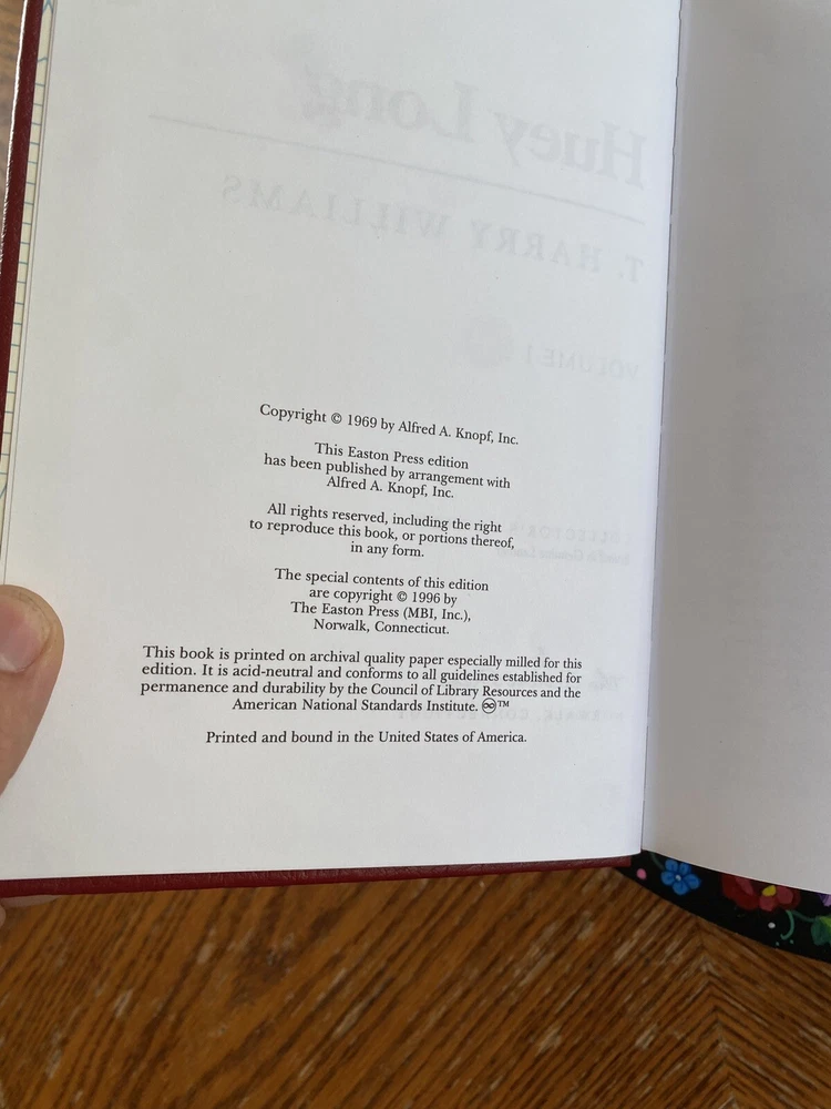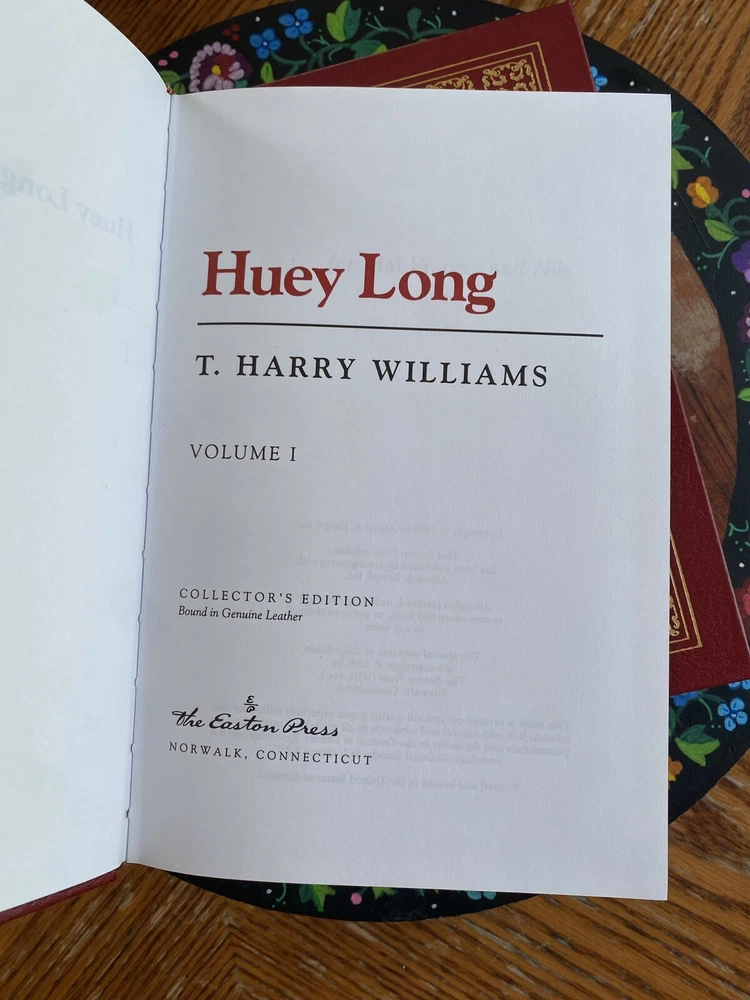 𝕯𝖊𝖆𝖗 𝖗𝖊𝖆𝖉𝖊𝖗, Here we have the 1996 leather bound 2 volume edition of the biography of HUEY LONG written by T. Harry Williams and published by the legendary EASTON PRESS. Books are in NEAR FINE condition with minimal shelf wear and a few dents along the board edges. There are NO ATTACHED BOOKPLATES. Please refer to pictures for more detailed information on condition. Thank you for considering these books. - 𝕮𝖆𝖘𝖘𝖎 ❂ 𝖉𝖔𝖗𝖚𝖘