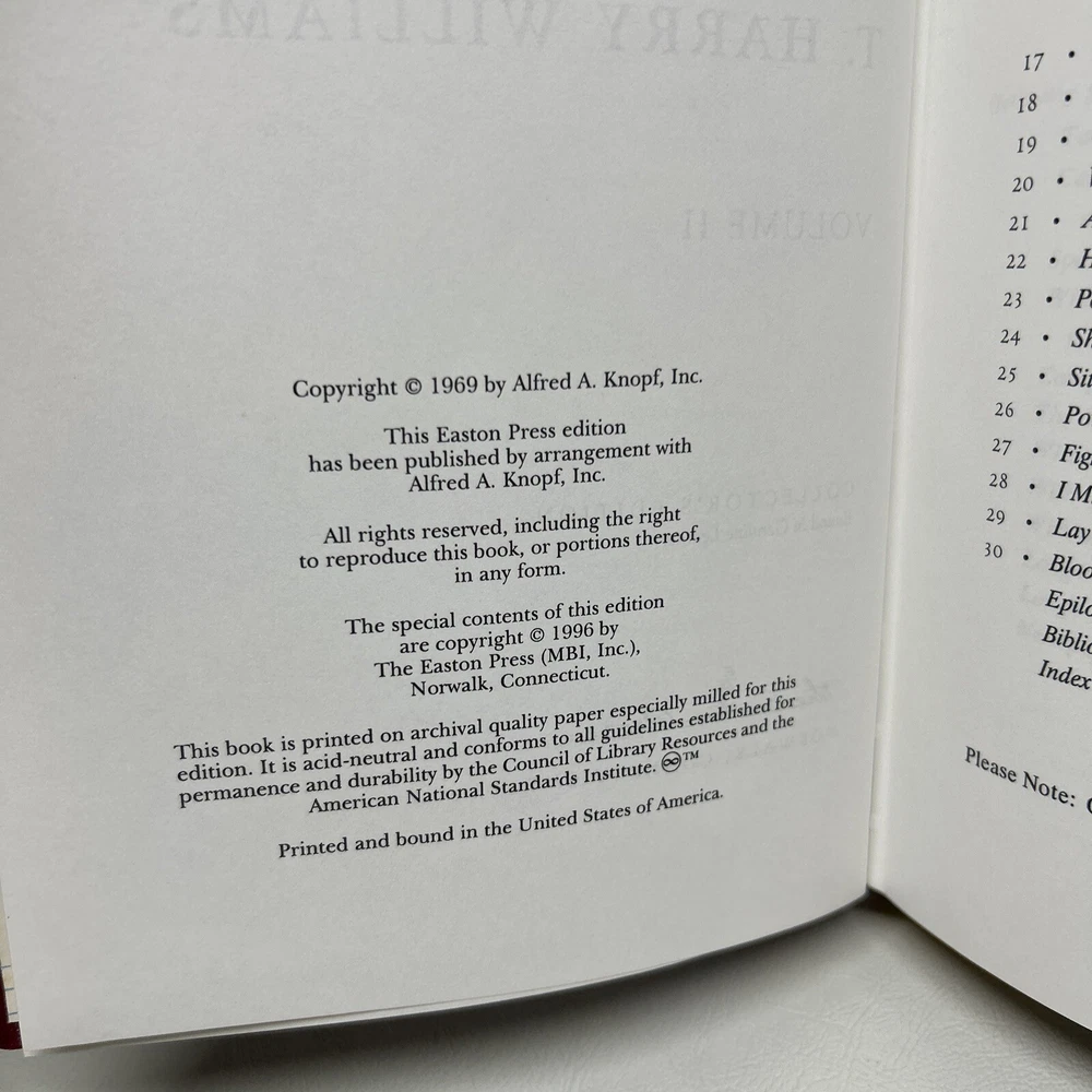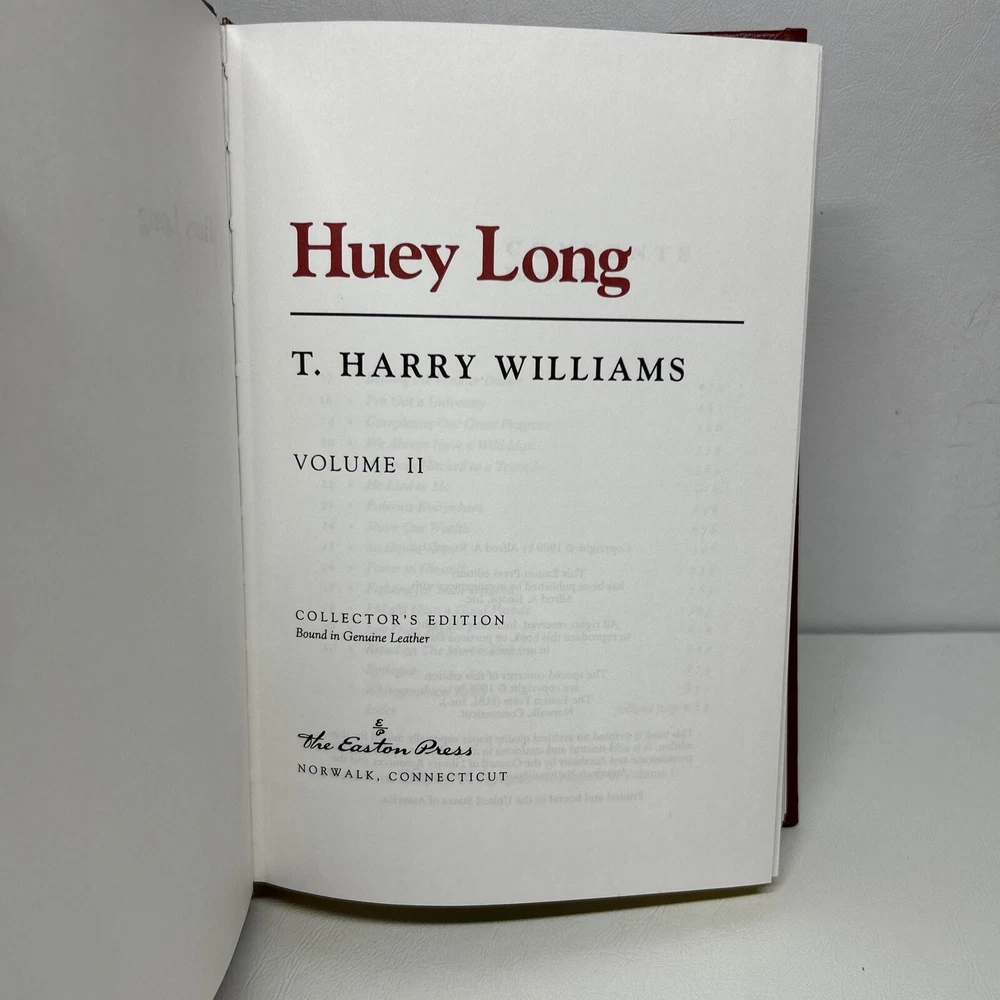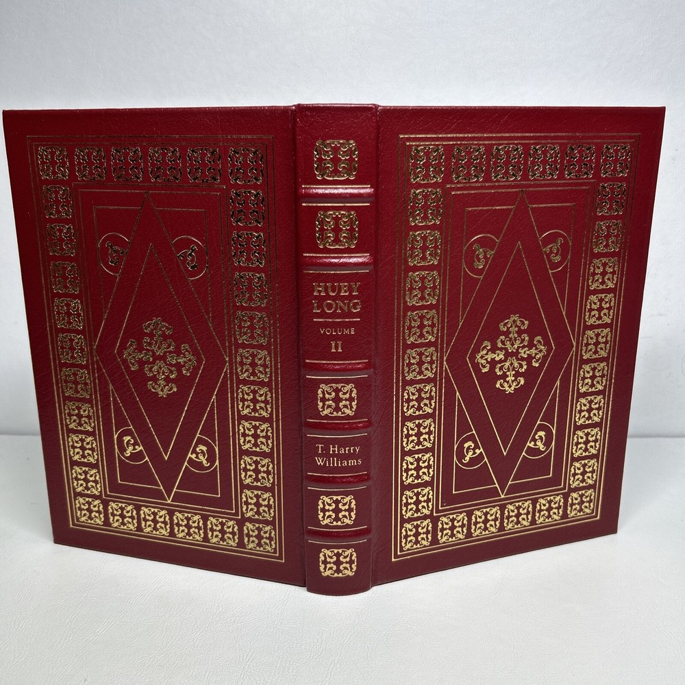 This collector's edition book, titled "EASTON PRESS: Huey Long Vol II," is about the Louisiana politician, Huey Long. The book features illustrations, and was published by Easton Press in 1996. It is an original copy, written in English by T. Harry Williams and bound in leather. The book's place of publication is Norwalk, Connecticut. It is categorized under "Books & Magazines" and "Antiquarian & Collectible." This book would make a great addition to any collection, especially for those interested in politics or biographies.