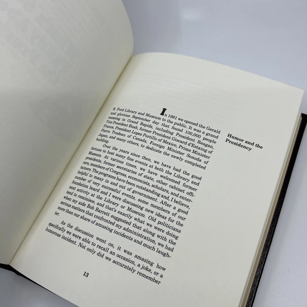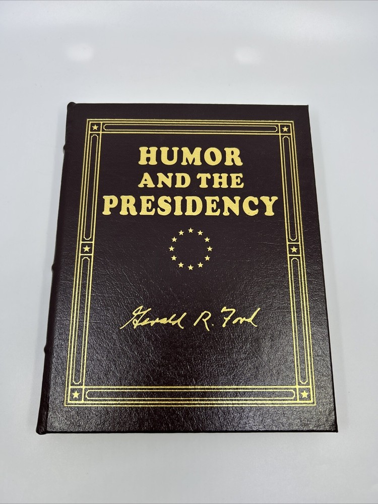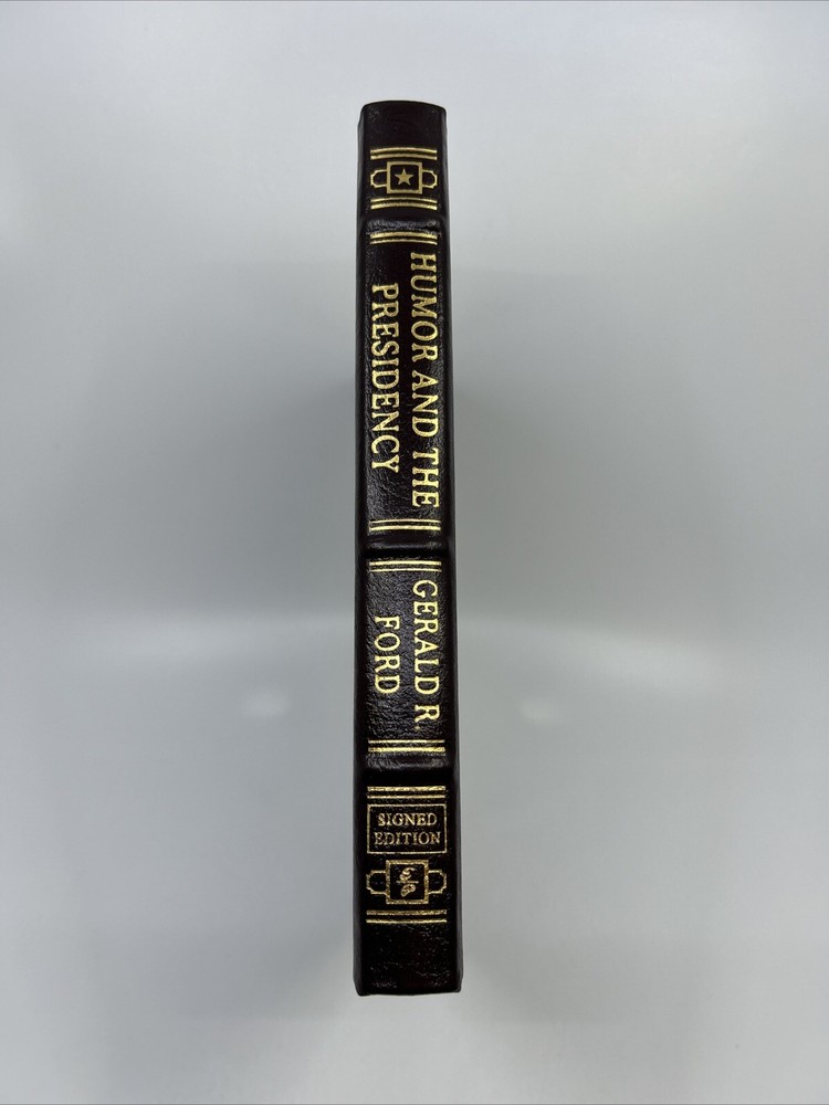 This Easton Press leather-bound edition of *Humor and the Presidency* by Gerald Ford is a fantastic collector's piece! The signed edition adds great value, and despite some minor shelf wear and gilt spotting, the book remains in very good condition. The elegant leather cover and classic design make it a standout addition to any library. Perfect for history buffs or Ford admirers—don’t miss the chance to own this unique signed treasure!