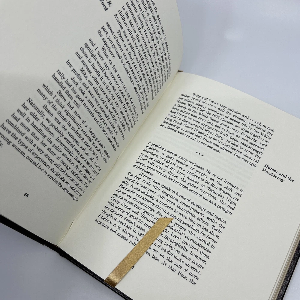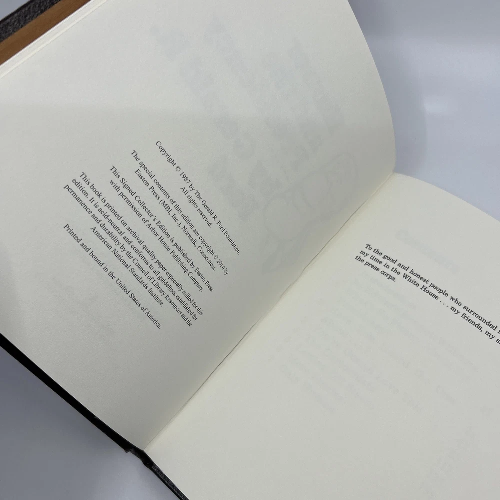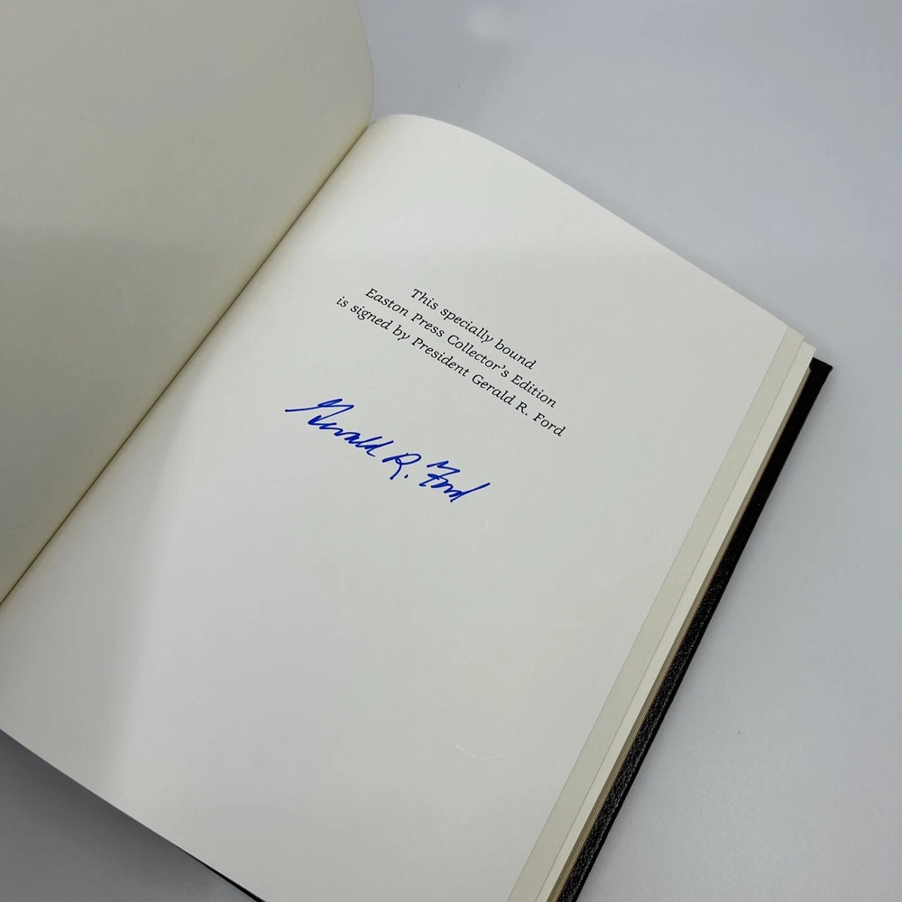 >>> GET IT NOW & ADD IT TO YOUR LIBRARY TODAY! <<< Leather-bound Easton Press SIGNED EDITION of Humor and the Presidency by Gerald Ford (SE) Condition – Very Good; blank bookplate attached to front moire endsheet; no embossed seal/no signatures or markings ; some shelf wear/marks/scratches/flaking/spotting to page gilt including some moisture stains to top gilt portion with no apparent damage to pages; slight shelf wear/marks/rubbing/bumps to leather covers; may have some dust from storage; please see all photos for details - photos are part of description; from an adult only smoke & pet free household; owl not included Shipping – boxed USPS Media Mail or Priority Mail (selectable at checkout); no international shipping (please do not ask) Payment – within two days from the listing's end (Best Offer acceptance) unless prior arrangements have been made No Returns/Sold 'As Is' – please contact me if you have any additional questions/issues or with requests for additional pictures >>> GET IT NOW & ADD IT TO YOUR LIBRARY TODAY! <<< *The only true First Editions (1 st Editions) from Easton Press you can be 100% certain about are books with “Signed First Edition " gilt-stamped on the leather spine or “Signed First Edition " printed on the title page and/or on the signature page. It is impossible to tell if any other Easton Press book is a first edition or first printing. Please keep that in mind and if not sure ask sellers for photos proving their claim. **Easton Press does not provide the actual print date in their books. For "Year Printed" the copyright date is listed (oftentimes from the original Heritage Press editions, rights to which were sold to Easton Press), which may or may not indicate an accurate range for manufacture of the book. ***Please note that Easton Press’s term Collector’s Edition is not synonymous with Limited Edition (LE). The only true Limited Editions from Easton Press are copies hand-numbered on the limitation page (i.e. ‘Number 1 of 1200’ or ‘This edition is strictly limited to a quantity of 1200 copies of which this is number 1’). Please keep that in mind and if not sure ask sellers to prove their claim.