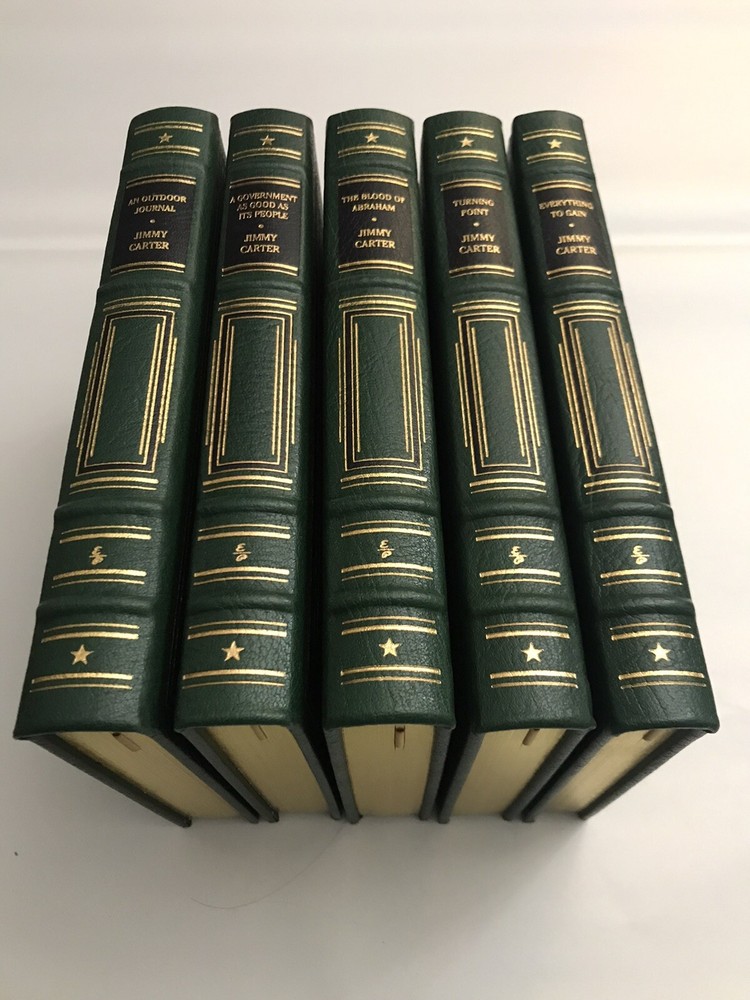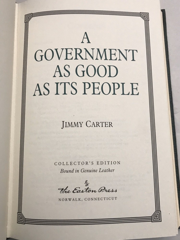 Jimmy Carter A GOVERNMENT AS GOOD AS ITS PEOPLE Easton Press Leatherbound Collector's Edition Book features full leather binding, 22-kt. gold stamping on the cover and spine, archival paper, a satin ribbon page marker, and all edges gilt. Book is in fine condition (faint edgewear, faint wear to gilt on page edges, no writing inside, no highlighting, no creased pages, no attached bookplate, no embossed seal). NOTE: The last three photos show this book grouped with other Jimmy Carter Easton Press books I have on eBay; however, this listing is for just one book.