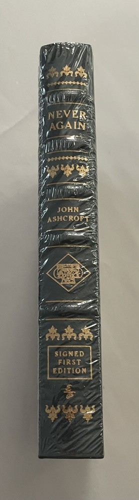 John Ashcroft NEVER AGAIN Signed First Edition Easton Press Leatherbound Collector's Edition Beautiful leatherbound book from Easton Press featuring a traditional hubbed spine, 22-kt. gold accents on the cover and spine, a satin ribbon page marker, silk moire endpapers, archival paper, and all edges gilt. Book is SIGNED by the author on a special signature page. Book is in new condition (in publisher's shrinkwrap).