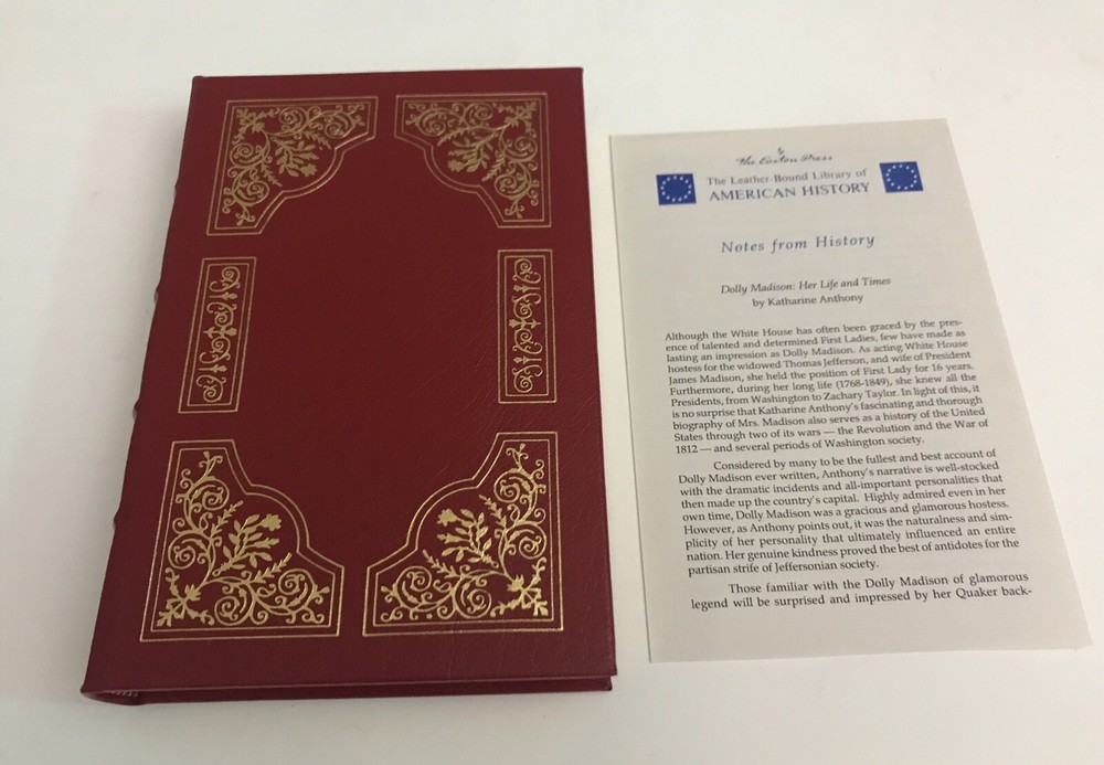 Katharine Anthony DOLLY MADISON HER LIFE & TIMES Easton Press Leatherbound Collector's Edition Leather-Bound Library of American History Easton Press books are bound in premium, hand-selected leather and have decorative accents stamped of 22kt. gold. They also feature hubbed spines, archival paper, and satin ribbon page markers. Book is in fine condition (faint edgewear, faint wear to gilt on page edges , no writing inside, no highlighting, no attached bookplate, and no embossed seal). Includes sheet that describes the book issued by the Easton Press laid in.