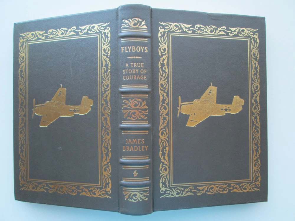 I Combine Shipping ~ !! Flyboys ~ by James Bradley ~ 2018, Easton Press ~ Genuine, premium leather-bound hardcover. Tight, Smyth-sewn binding, clean inside and out. Spine is hubbed and cover is accented in 24K gold design. Spine is straight and corners are fairly sharp. Cover has mild wear/rubbing along edges/corners. All three text edges are gilded with a few imperfections. Attached ribbon marker. Endpapers are of rich moire fabric with no fading . 398 thick, crisp, cream-colored, acid-neutral pages.