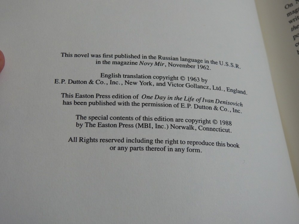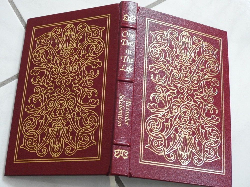 TITLE : One Day in the Life AUTHOR : Alexander Solzhenitsyn PUBLISHER/COPYRIGHT : original c 1962, this is 1988 Easton Press Collector's Edition ILLUSTRATIONS : color frontispiece DIMENSIONS : approx 6" x 9" x 160 pages CONDITION : Leather bound hardback book, Collector's Edition, all edges gilt, moire endpapers, self ribbon bookmark, hubbed spine. Interior clean and unmarked by former owner. Check out my other items as I frequenlty list related items in the same week! PLEASE CHECK MY EBAY STORE....I PLACE MANY ITEMS IN THE STORE, WHICH DOES NOT BENEFIT FROM EBAY SEARCH, SO YOU MAY FIND A TREASURE THERE! b204/7a