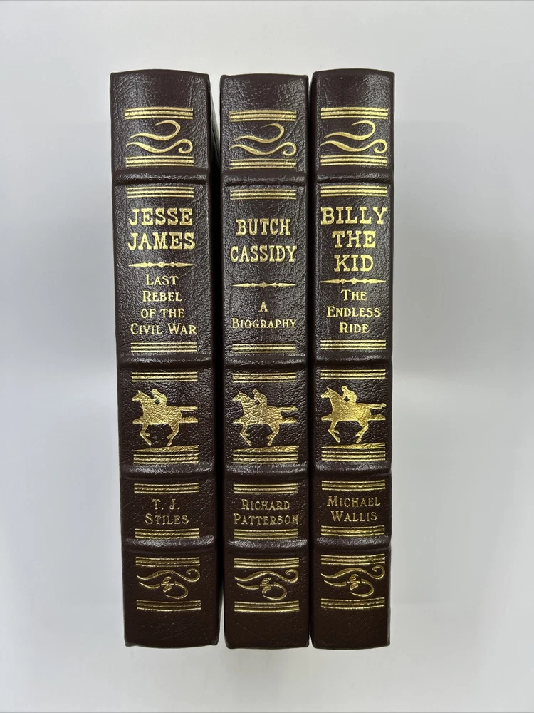 >>> GET IT NOW & ADD IT TO YOUR LIBRARY TODAY! <<< Leather-bound Easton Press 3-volume collector's edition of Outlaws of the West in matching cover design: Jesse James: Last Rebel of the Civil War by T.J. Stiles Butch Cassidy: A Biography by Richard Patterson Billy the Kid: The Endless Ride by Michael Wallis Condition – Very Good/Excellent; no attached bookplates/no embossed seal/no signatures or markings ; slight shelf wear/marks/scratches/rubbing to page gilt; slight shelf wear/marks/rubbing/bumps to leather covers; may have some dust from storage; please see all photos for details - photos are part of description; from an adult only smoke & pet free household; owl not included Shipping – boxed USPS Media Mail; no international shipping (please do not ask) Payment – within two days from the listing's end (Best Offer acceptance) unless prior arrangements have been made No Returns/Sold 'As Is' – please contact me if you have any additional questions/issues or with requests for additional pictures >>> GET IT NOW & ADD IT TO YOUR LIBRARY TODAY! <<< *The only true First Editions (1 st Editions) from Easton Press you can be 100% certain about are books with “Signed First Edition " gilt-stamped on the leather spine or “Signed First Edition " printed on the title page and/or on the signature page. It is impossible to tell if any other Easton Press book is a first edition or first printing. Please keep that in mind and if not sure ask sellers for photos proving their claim. **Easton Press does not provide the actual print date in their books. For "Year Printed" the copyright date is listed (oftentimes from the original Heritage Press editions, rights to which were sold to Easton Press), which may or may not indicate an accurate range for manufacture of the book. ***Please note that Easton Press’s term Collector’s Edition is not synonymous with Limited Edition (LE). The only true Limited Editions from Easton Press are copies hand-numbered on the limitation page (i.e. ‘Number 1 of 1200’ or ‘This edition is strictly limited to a quantity of 1200 copies of which this is number 1’). Please keep that in mind and if not sure ask sellers to prove their claim.
