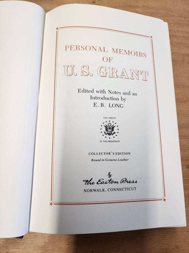 This collector's edition book from Easton Press features the Personal Memoirs of U.S. Grant, edited by E.B. Long. The leather binding adds a touch of elegance to this Civil War military history book. The author, U.S. Grant, is well-known for his role in the Civil War and this book provides a unique perspective on his experiences. The book is written in English and is a great addition to any history or military enthusiast's collection. (E21)