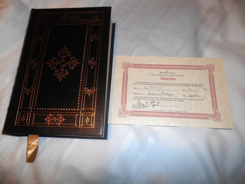 This is a rare and highly sought-after book titled "Buckley; The Right Word" by William Buckley Jr., published by Easton Press in a limited collector's edition. The book is numbered #1036/900 and comes with a Certificate of Authenticity. It is a first edition, printed in 1996. The book appears to be in very condition with minimum wear. The cover has a slight warp to it and does not shut completely flat. I'm not a professional book grader, so if you have any questions, please feel free to email me. Also please check out the photos. I have approximately 50 Easton Press books that I acquired that I will be listing in the next several weeks. Many ae signed, so keep checking in.