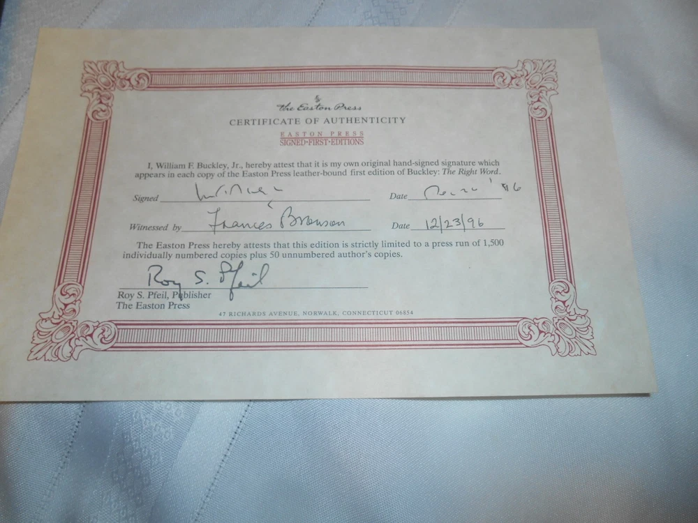 This limited Easton Press edition of Buckley's *The Right Word* is a true collector's gem! The signed copy (#1036/1500) adds incredible value, and the book itself is in excellent shape—just a slight warp on the cover, but nothing major. The Certificate of Authenticity is a nice touch, making it perfect for fans of Buckley or rare book enthusiasts. A fantastic find for any serious collector!
