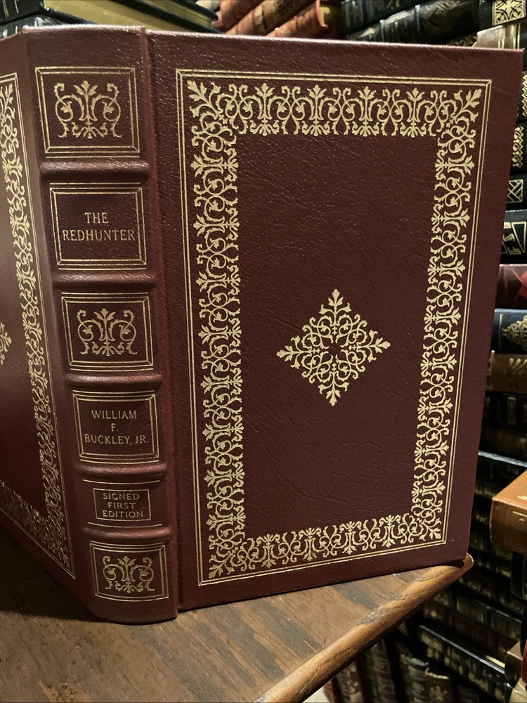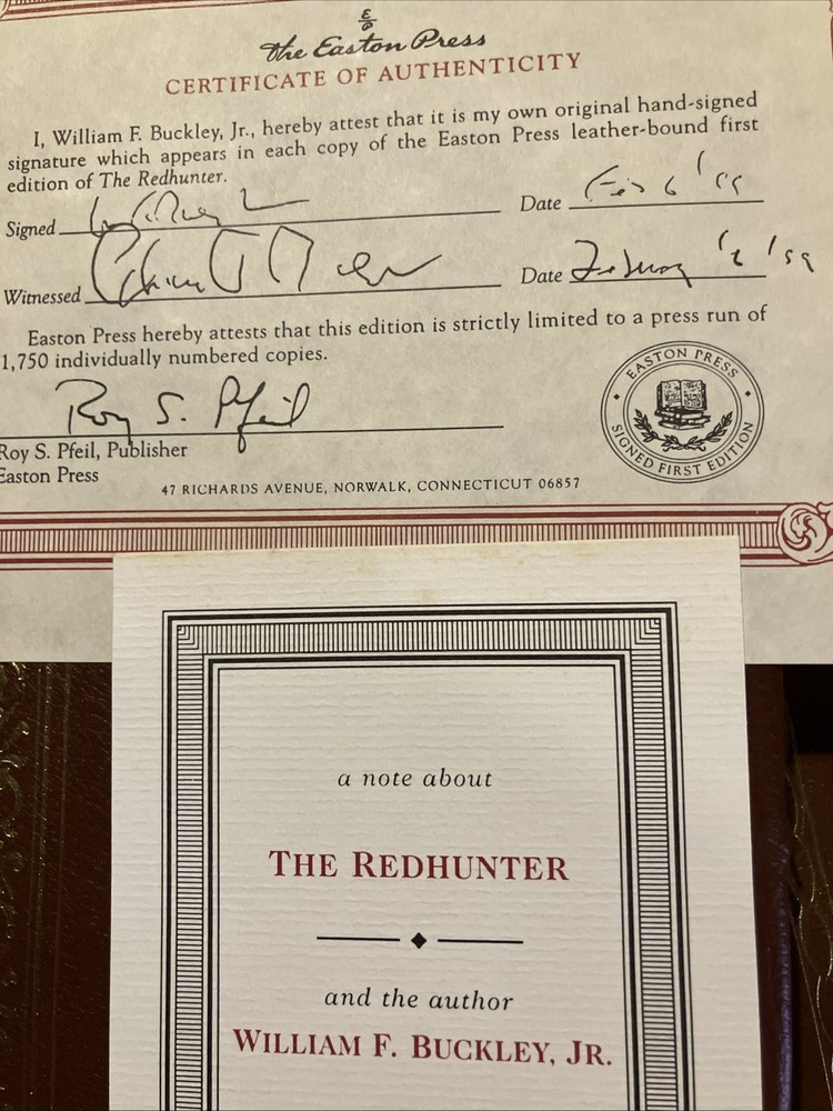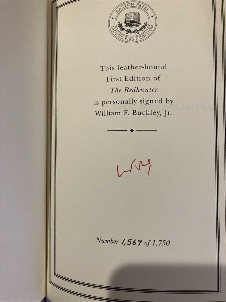Easton Press leather edition of William F. Buckley's "The Redhunter: A Novel Based on the Life of Senator Joe McCarthy," a SIGNED FIRST EDITION, Personally signed by WILLIAM F. BUCKLEY, Jr., published in 1999. Bound in brown leather, the book has camel tan moire end leaves, Symth-sewn binding, hubbed spine, acid-free paper, a satin book marker, gold gilding on three edges---in near Fine condition. CERTIFICATE OF AUTHENTICIY signed on February 8, 1999, this volume is 1567 of 1,750. William Frank Buckley Jr., who lived from 1925--2008, was an American public intellectual and conservative author and commentator. In 1955, Buckley founded National Review, a magazine that stimulated the conservative movement in the late-20th century United States. Buckley hosted 1,429 episodes of the public affairs television show FIRING LINE (1966–1999), the longest-running public affairs show in television history with a single host, where he became known for his transatlantic accent and wide vocabulary. Buckley wrote more than fifty other books on diverse topics, including writing, speaking, history, politics, and sailing. Buckley also penned a nationally syndicated newspaper column. Buckley referred to himself as either a libertarian or conservative. For an entire generation, he was the preeminent voice of American conservatism. In a prologue to "The Redhunter," a history professor and former McCarthy colleague named Harry Bontecou sits reading a newspaper in a London Club in 1991. Harry muses over similar carnages committed by Stalin, the Nazis, and the East Germans. Harry soon resolves to tell his version of the McCarthy years. After graduating from Columbia, Bontecou goes to work for McCarthy, only to find his own passionate pursuit of conservatism betrayed by the senator's penchant for half-cooked, extemporaneous accusation of treason, forcing Bontecou to distance himself from his mentor as the backlash grows. The depiction of McCarthy's upbringing on a Wisconsin chicken farm is affecting. In the Acknowledgements, Buckley wrote: "I knew Senator McCarthy and, with my brother-in-law, the late L. Brent Bozell, wrote a book about him. This book is a novel, but most of the events here recorded are true to life." Claiming to have proof that hundreds of individuals "loyal to the Communist Party" were working in the U.S. Government, McCarthy led post-war Anti Communist investigations for which he became a national celebrity. His influence came to an end when the Senate condemned him in 1954. McCarthy was a demagogue who ruined hundreds of lives. Buckley is "charming, witty, provocative, and eloquent." 421 pages, including an Index. I offer Combined shipping.