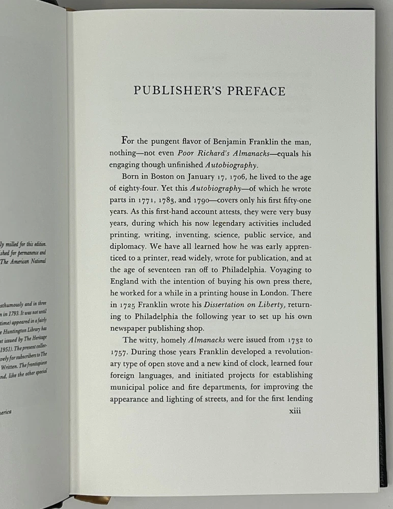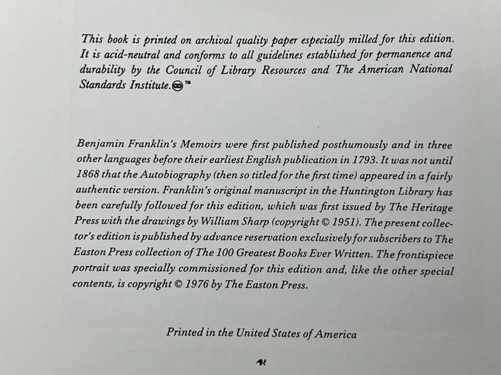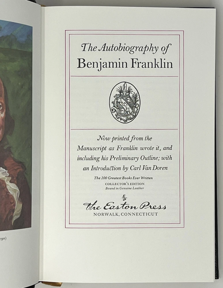 EASTON PRESS: The Autobiography of Benjamin Franklin: Collector's Edition - 1976 Genuine Leather-Bound Hardcover Published by The Easton Press Please see pictures to determine the exact condition of this book. Please send a message if you have any questions. We ship promptly.