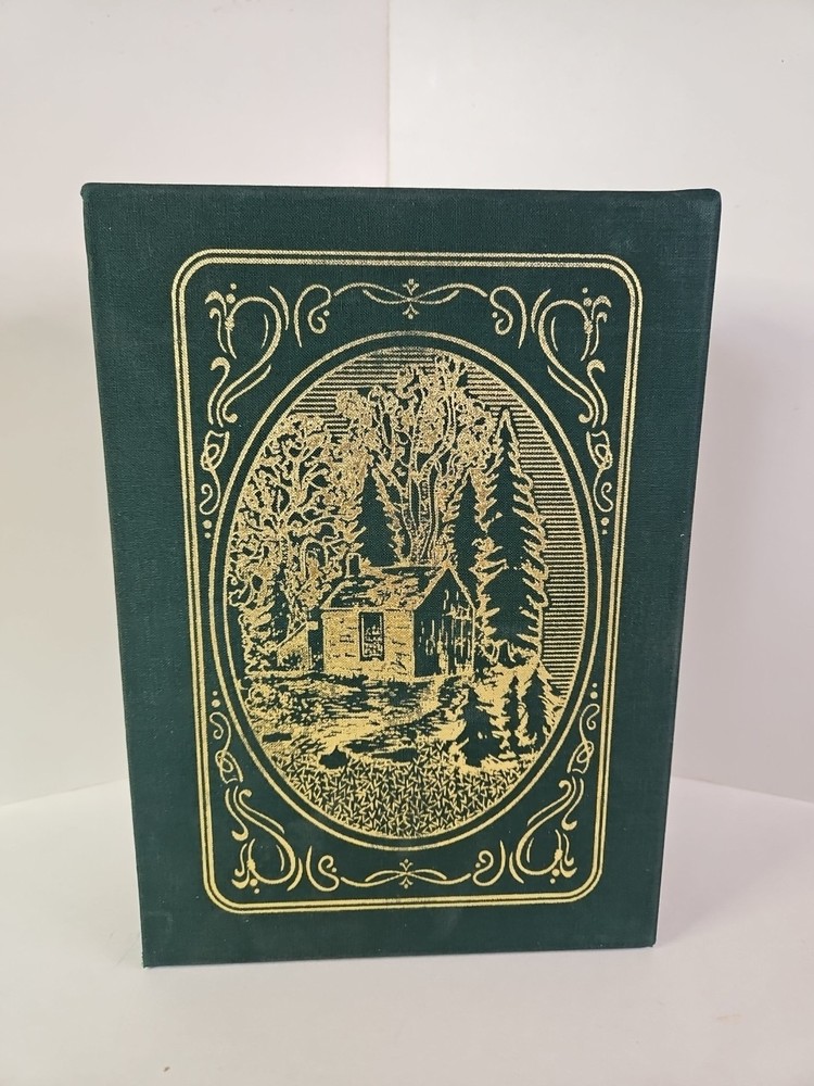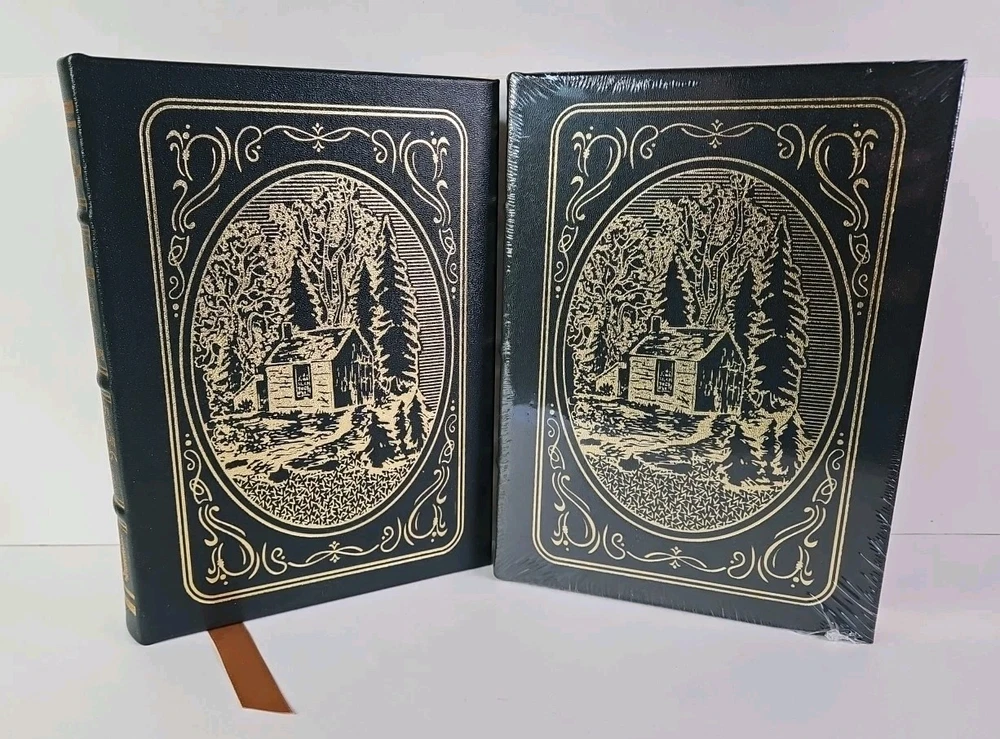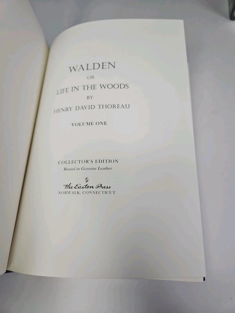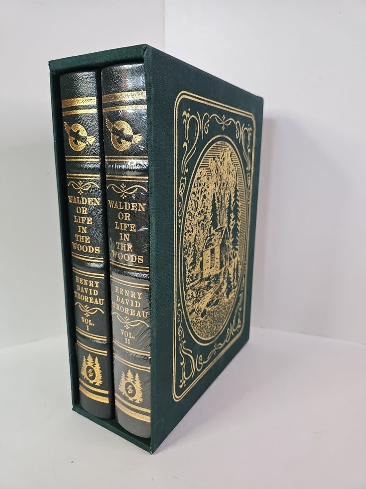 Deluxe Slipcase Edition. Easton Press WALDEN, or, Life in the Woods in 2 vols. Volume 2 is still sealed. Henry David Thoreau An exclusive Deluxe Illustrated Edition A re-creation of the 1909 edition privately published for members of the Bibliophile Society, Boston: 1. Black and white plates throughout 2. Cowhide leather imported from Italy 3. Clothbound slipcase featuring a matching design and lined with crushed velvet to protect the leather cover. measured by 6 3/4" x 9 1/4", 394pp out-of-print, do not miss out this good deal Copyright by The Easton Press hubbed spine, bound in premium full leathers distinctive cover design, beautiful illustrations handsome, readable typefaces, permanent satin ribbon page marker elegant gilded page edges, endsheets of rich mabled pattern thread-sewn pages for durability and strength, long-lasting high quality, acid-neutral paper CONDITION DESCRIPTION: The book is in like new and unread condition: binding is tight, gold page edging still shiny, beautiful bright endleaves and satin ribbon page marker. It will make a great addition to any library. SHIPPING / HANDLING: Book(s) will be handled/packed very safely, and shipped via USPS media mail with delivery confirmation.