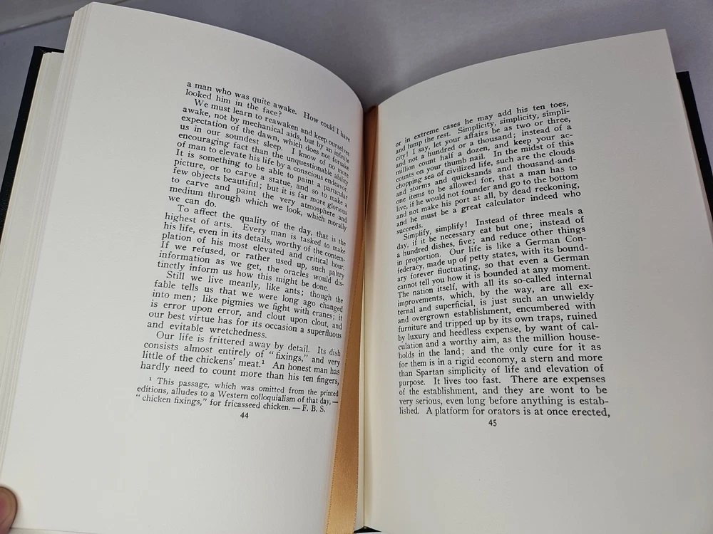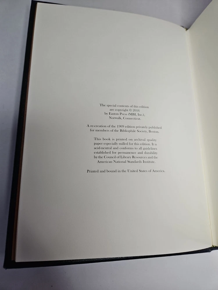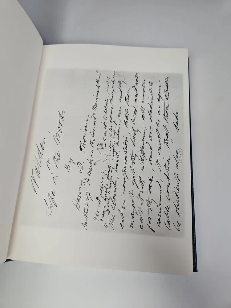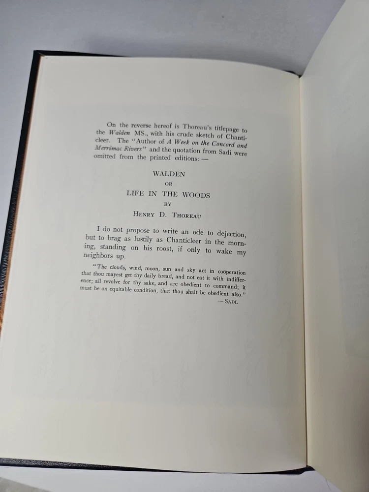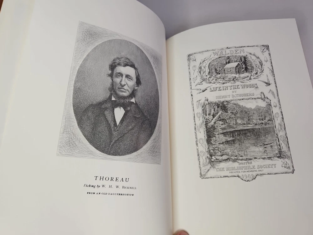 Deluxe Slipcase Edition. Easton Press WALDEN, or, Life in the Woods in 2 vols. Volume 2 is still sealed. Henry David Thoreau An exclusive Deluxe Illustrated Edition A re-creation of the 1909 edition privately published for members of the Bibliophile Society, Boston: 1. Black and white plates throughout 2. Cowhide leather imported from Italy 3. Clothbound slipcase featuring a matching design and lined with crushed velvet to protect the leather cover. measured by 6 3/4" x 9 1/4", 394pp out-of-print, do not miss out this good deal Copyright by The Easton Press hubbed spine, bound in premium full leathers distinctive cover design, beautiful illustrations handsome, readable typefaces, permanent satin ribbon page marker elegant gilded page edges, endsheets of rich mabled pattern thread-sewn pages for durability and strength, long-lasting high quality, acid-neutral paper CONDITION DESCRIPTION: The book is in like new and unread condition: binding is tight, gold page edging still shiny, beautiful bright endleaves and satin ribbon page marker. It will make a great addition to any library. SHIPPING / HANDLING: Book(s) will be handled/packed very safely, and shipped via USPS media mail with delivery confirmation.