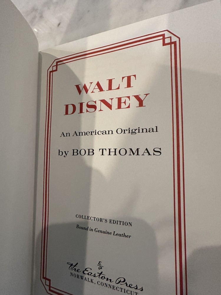 This is a leather bound Easton Press edition of "Walt Disney: An American Original" by Bob Thomas. The book is in VG condition with no notable imperfections of the leather, gilt, or page edges. It just has a little general shelfwear.