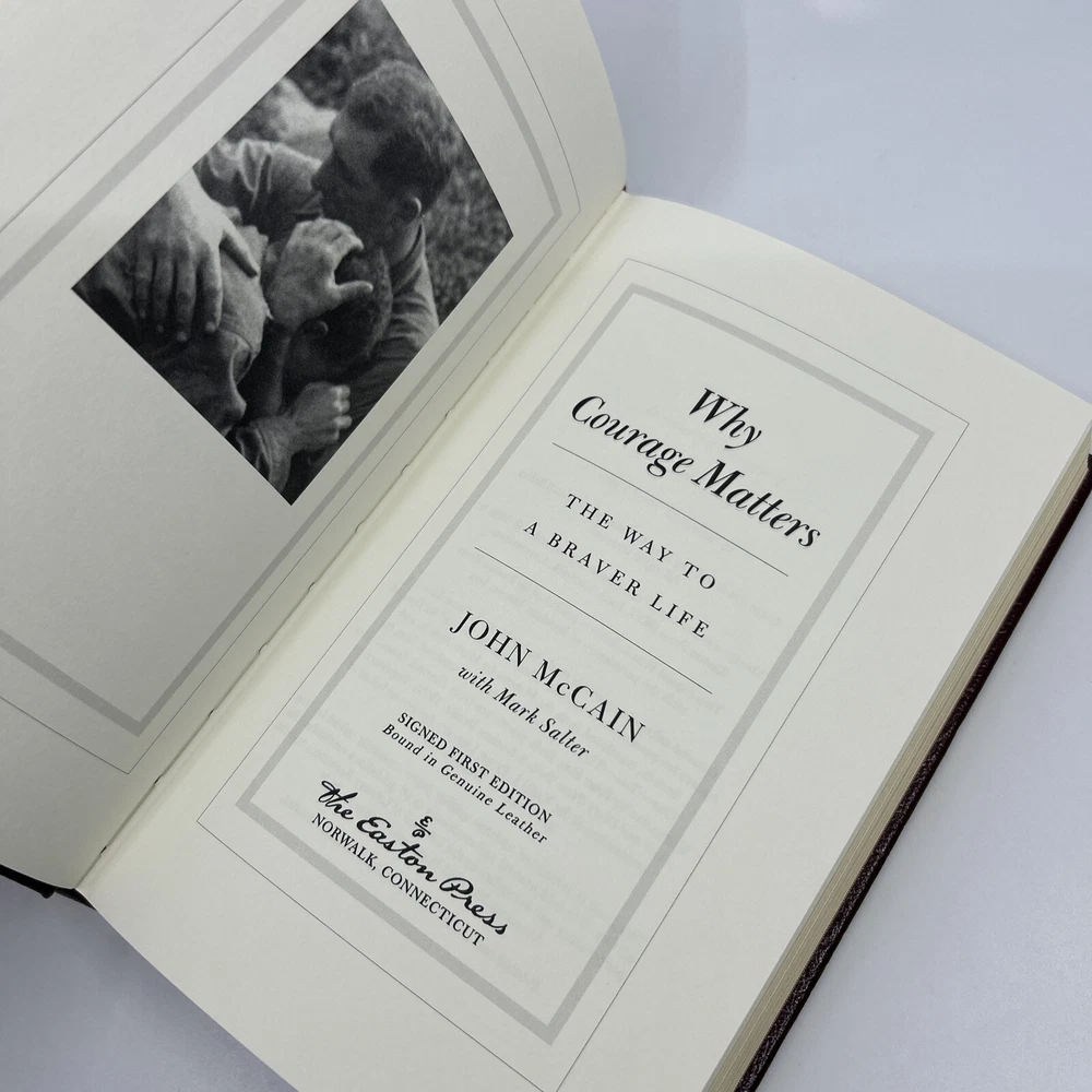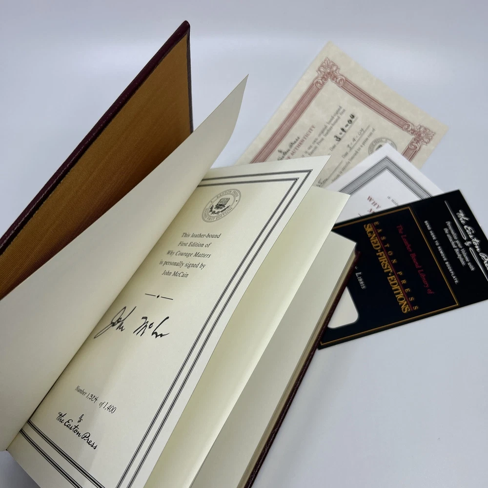 >>> GET IT NOW & ADD IT TO YOUR LIBRARY TODAY! <<< Leather-bound Easton Press collector's SIGNED FIRST EDITION of Why Courage Matters by John McCain (SFE) Condition – Very Good/Excellent; no attached bookplate/no embossed seal/no signatures or markings ; slight shelf wear/marks/scratches/rubbing to page gilt; slight shelf wear/marks/rubbing/bumps to leather covers ; original Note & Certificate of Authenticity (COA) included ; loose blank bookplate laid in; may have some dust from storage; please see all photos for details - photos are part of description; from an adult only smoke & pet free household; owl not included Shipping – boxed USPS Media Mail or Priority Mail (selectable at checkout); no international shipping (please do not ask) Payment – within two days from the listing's end (Best Offer acceptance) unless prior arrangements have been made No Returns/Sold 'As Is' – please contact me if you have any additional questions/issues or with requests for additional pictures >>> GET IT NOW & ADD IT TO YOUR LIBRARY TODAY! <<< *The only true First Editions (1 st Editions) from Easton Press you can be 100% certain about are books with “Signed First Edition " gilt-stamped on the leather spine or “Signed First Edition " printed on the title page and/or on the signature page. It is impossible to tell if any other Easton Press book is a first edition or first printing. Please keep that in mind and if not sure ask sellers for photos proving their claim. **Easton Press does not provide the actual print date in their books. For "Year Printed" the copyright date is listed (oftentimes from the original Heritage Press editions, rights to which were sold to Easton Press), which may or may not indicate an accurate range for manufacture of the book. ***Please note that Easton Press’s term Collector’s Edition is not synonymous with Limited Edition (LE). The only true Limited Editions from Easton Press are copies hand-numbered on the limitation page (i.e. ‘Number 1 of 1200’ or ‘This edition is strictly limited to a quantity of 1200 copies of which this is number 1’). Please keep that in mind and if not sure ask sellers to prove their claim.