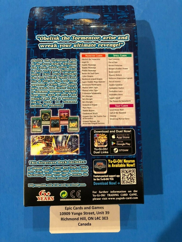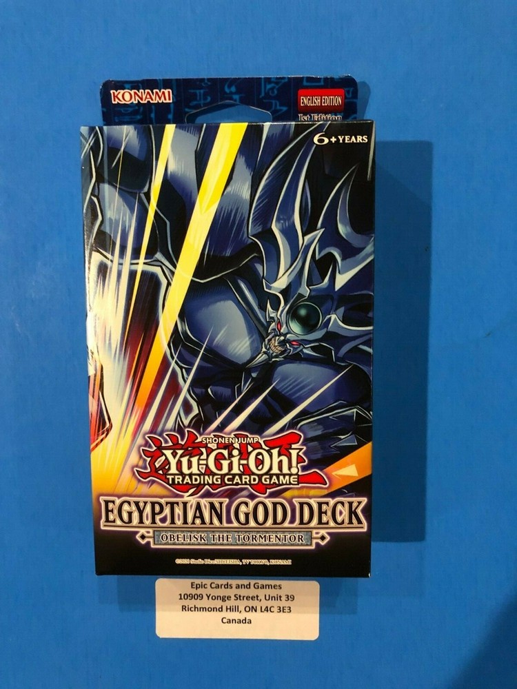 You are bidding on : 1 x Yu-Gi-Oh EGYPTIAN GOD DECK OBELISK THE TORMENTOR Starter Deck (1st Edition) Factory Sealed Awaken the power of the Egyptian God Cards! If you’ve ever wanted to build a Deck around an Egyptian God Card but didn’t know where to start, look no further than the Egyptian God Decks! Egyptian God Deck: Slifer the Sky Dragon/Egyptian God Deck: Obelisk the Tormentor serve up simple strategies to Summon and win with either Slifer the Sky Dragon or Obelisk the Tormentor . Slifer the Sky Dragon Slifer powers up depending on how many cards you have in your hand, so this Deck uses Token-generating effects to help you gather the 3 required Tributes while using fewer cards from your hand. After you have Slifer on the field, power it up with cards that let you draw more cards, like the brand-new Thunderforce Attack ! Based on Slifer’s signature attack, this Spell can destroy all your opponent’s face-up monsters at any time, but if you use it during your own Main Phase you can draw a card for each monster destroyed! Obelisk the Tormentor Unleash the true power of Obelisk the Tormentor by Tributing 2 monsters you control and wipe your opponent’s monsters off the field! This Deck uses self-replicating monsters to provide Tributes and protect your Life Points as you get closer to drawing your Divine Beast. Obelisk’s own ability can crush your opponent’s monsters all at once, but throw in the new Spell Card, Fist of Fate , and you can negate a monster’s effect and destroy it without needing to Tribute. Activate during your own Main Phase and you can crush all your opponent’s Spells and Traps as well! Each Egyptian God Deck is 40 cards total and includes 1 Egyptian God Card and 5 new cards – 4 unique new cards as well as 1 copy of Soul Crossing , a brand-new Quick-Play Spell Card included in both Decks that lets you Tribute Summon your Egyptian God Card by Tributing your opponent’s monsters! Each Deck is playable on its own straight out of the box and comes with a Dueling Guide that explains the basic strategy and some rules you should know to get the most out of your Deck. Of course, if you pick up both, you can mix and match their strategies to create an awesome Deck that can wield multiple Egyptian God Cards! Each Egyptian God Deck contains 40 cards: 4 Ultra Rares 4 Super Rares 32 Commons 1 Deluxe Game Mat/Dueling Guide *Name and content subject to change. Condition: Brand new and unopened near mint to mint condition You will get 1 deck from the box. Payment is due within 7 days of the end of this auction. We accept payments through PayPal only . PayPal is fast and secure and allows you to pay for your item(s) with any major credit card, PayPal account balance, or directly from your bank account. (If we don't have an item in stock due to inventory problems etc, we will refund your payment immediately, please understand these things happen and we try our best to make sure they don’t but mistakes can happen.) Shipping : Handling time: 1 - 3 Business days *“Business days” are normal weekdays. Saturdays, Sundays, and major holidays do not count as business days. Expedited within Canada ( S hipping is calculated based on your location. If you allow us to combine an invoice for you, additional boxes please add $2.99 shipping per box. ) USPS Tracked Package to the USA We are using US Postal Service (USPS) for all US customers and it will be $9.99 per deck. Additional deck, please add $2.99 each. Epic Cards and Games Any questions feel free to email us and allow 1 day for a response. Thanks for looking! Sales Tax (Canada Only) : Purchases made by Canadian residents are subject to applicable GST/HST, depending on your province/territory. (If you do not agree to this, please do not bid. We have a registered business in Canada and are required by law to charge taxes to anything shipped within the country.) THANK YOU and HAPPY BIDDING!